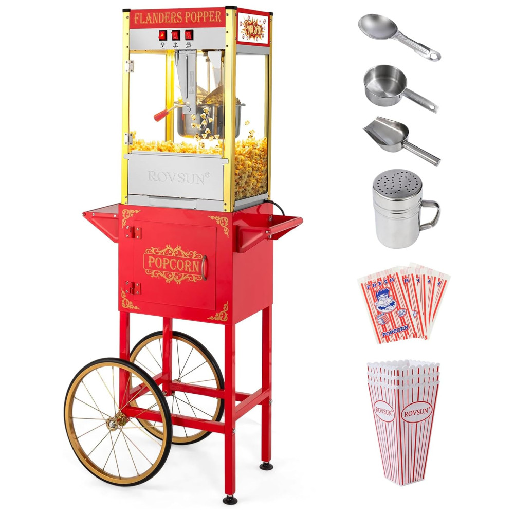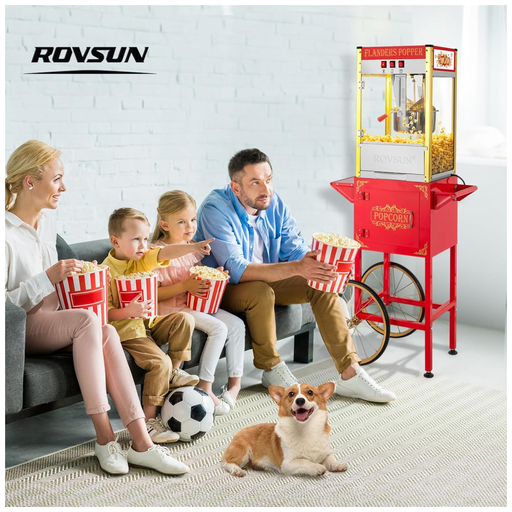 Máquina de Pipoca ROVSUN com Carrinho Rodas e Panela de 280 g faz até 15 L. Acompanha Concha de Aço Inox Colher de Óleo Sacos e 3 Copos.