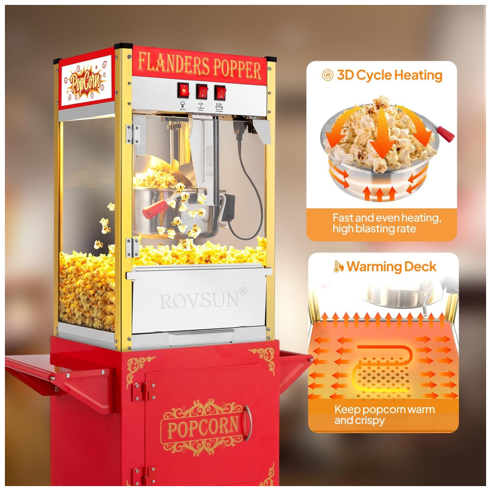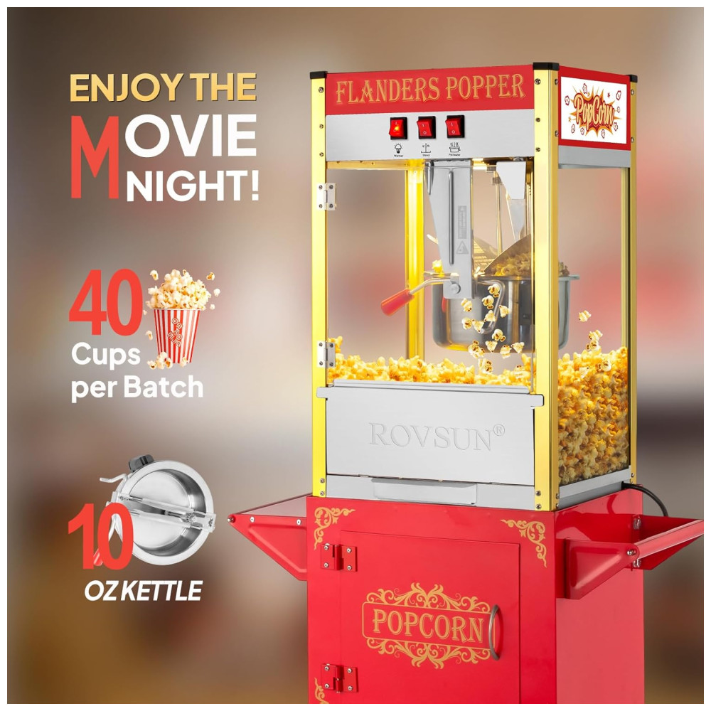 Máquina de pipoca ROVSUN com carrinho e rodas para fácil mobilidade, além de compartimento de armazenamento para acessórios.