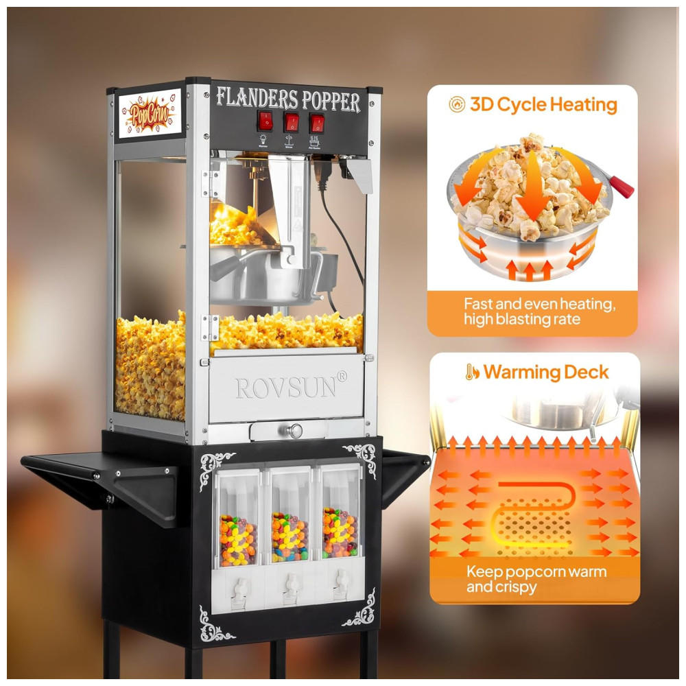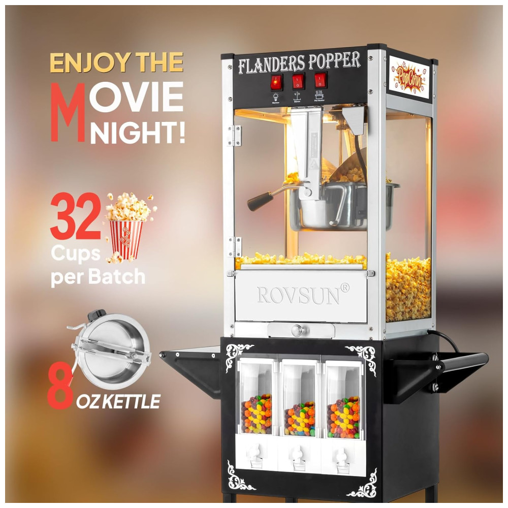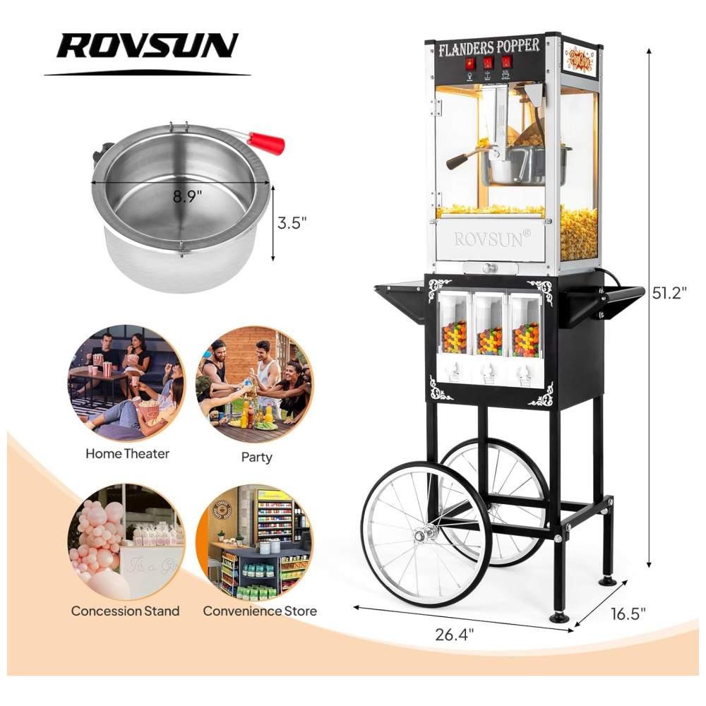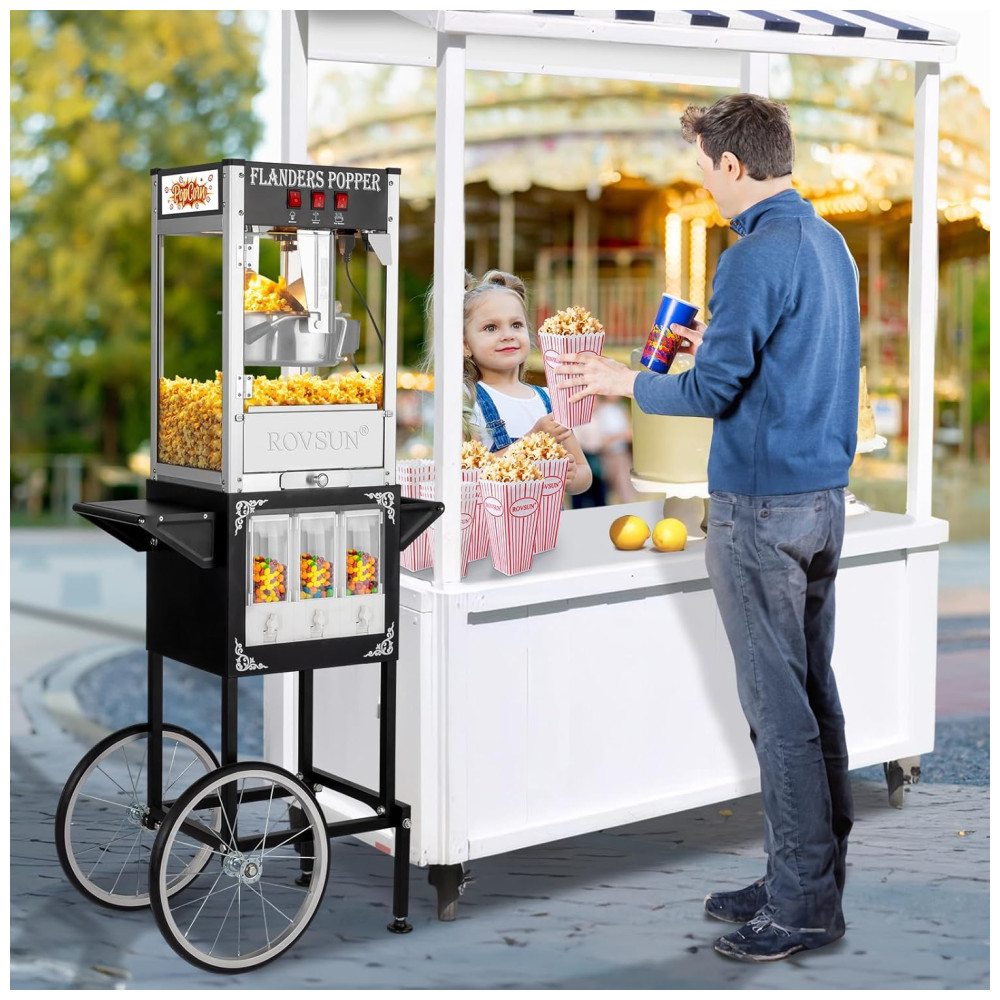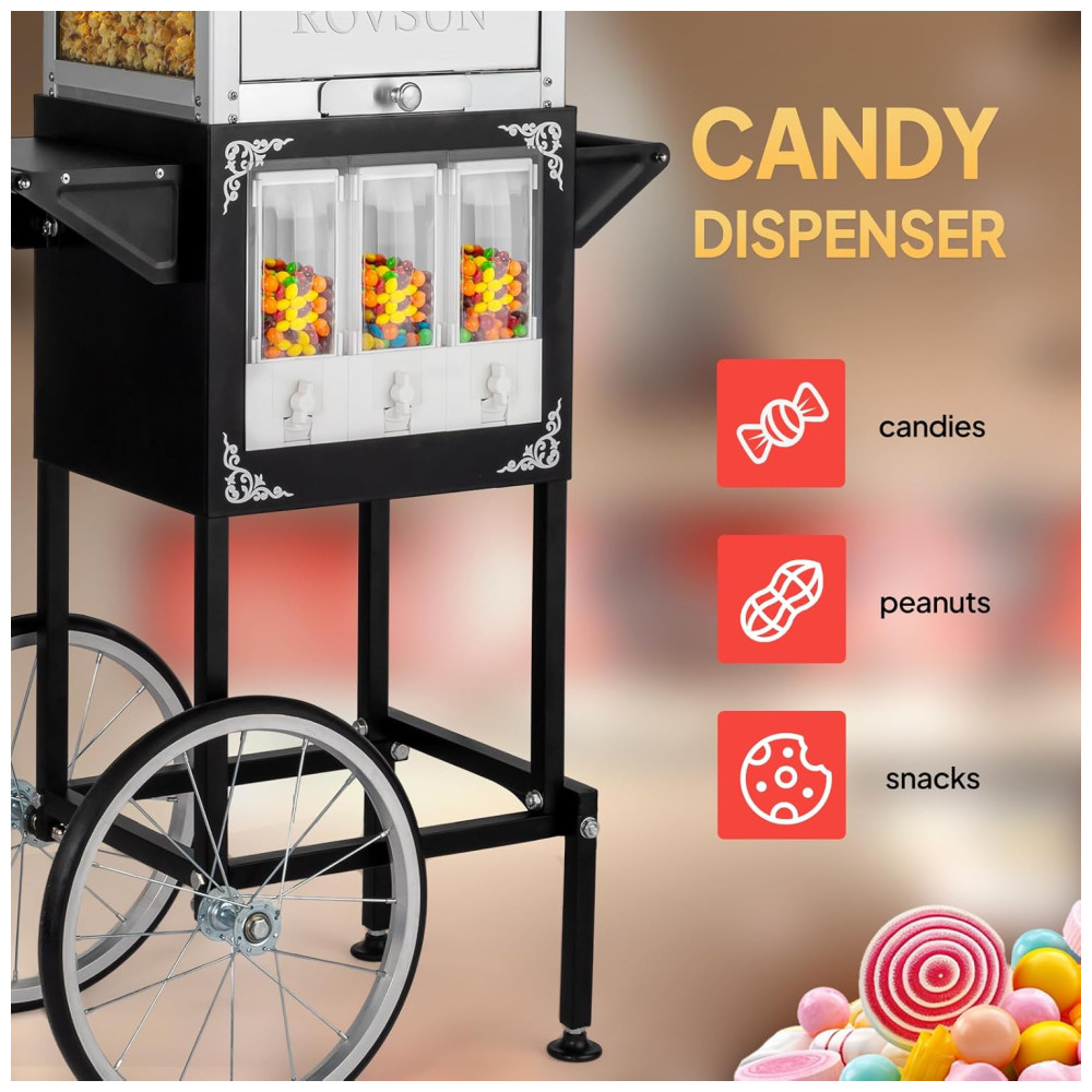 Máquina de Pipoca ROVSUN Estilo Cinema com Carrinho e Rodas Chaleira de 227 g Faz Até 75 Litros com Dispensadores de Doces Colher de Pipoca.