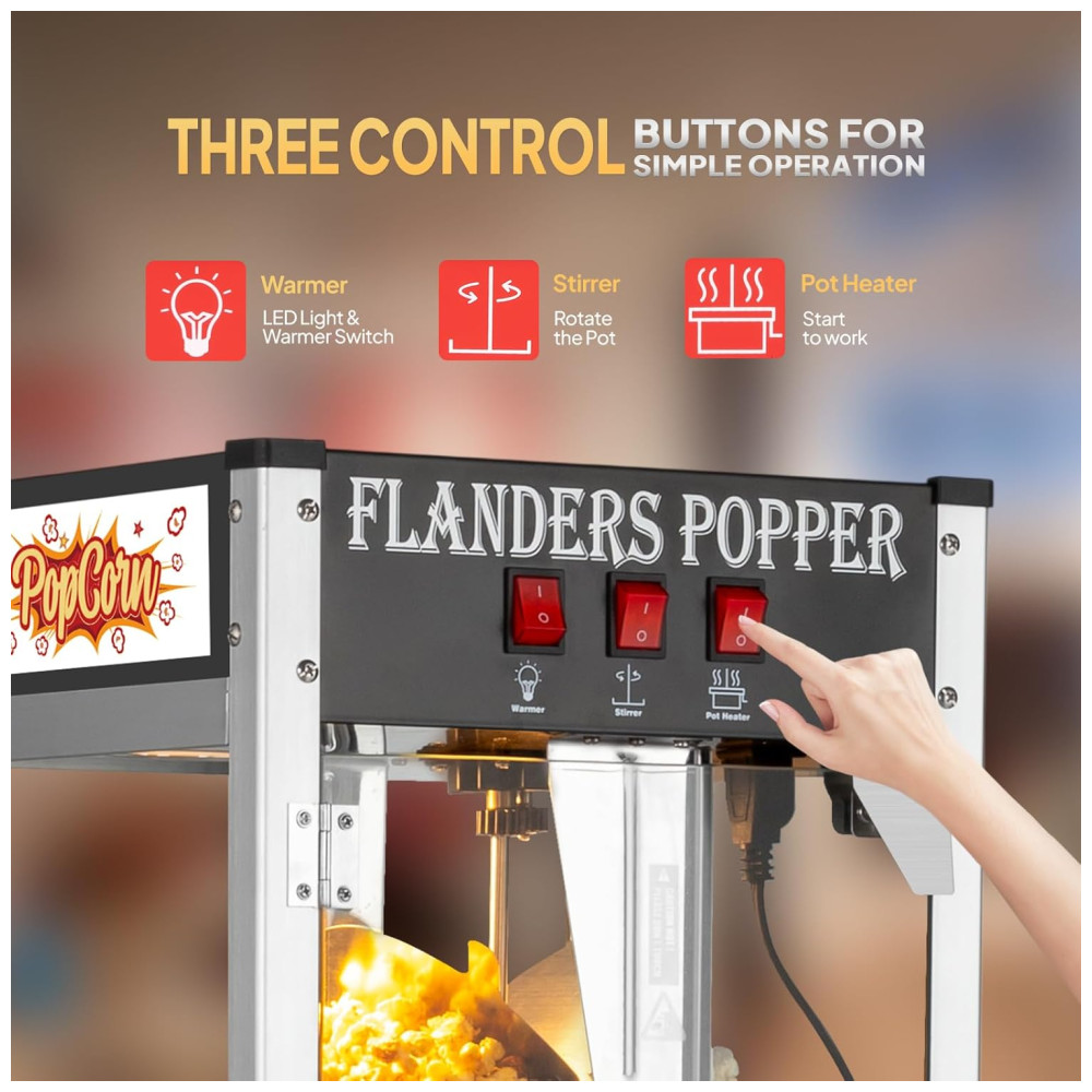 Acompanha Acessórios: A máquina de pipoca comercial vem com 1 colher de pipoca, 1 colher medidora de óleo, 1 colher de milho, 3 copos de pipoca, 30 sacos de pipoca e 1 agitador de potência.