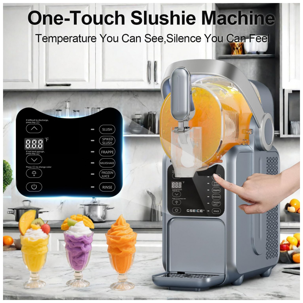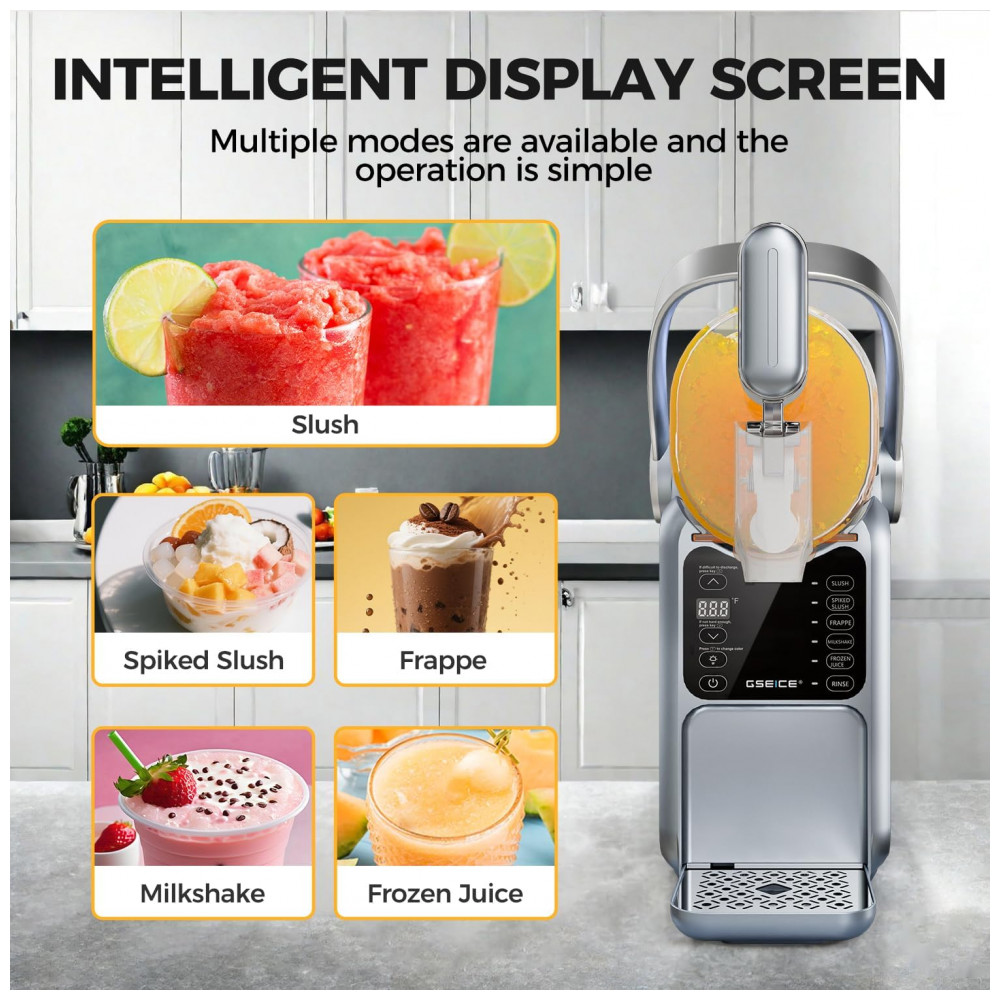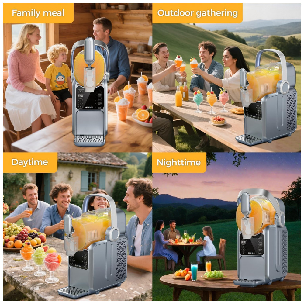 Chegou a hora de ter sua própria máquina de frozen em casa! Com a Máquina de Frozen da GSEICE, você não precisa mais ocupar espaço no congelador com gelo. Com capacidade de 2,9 litros e 5 modos pré-definidos, como Frozen, Frappé, Milkshake e Suco Congelado, você terá sempre a bebida gelada perfeita ao alcance de um toque. Com a exclusiva tecnologia de Resfriamento Rotacional 360, ela transforma líquido em frozen em 15 a 60 minutos, dependendo do conteúdo. O Display de Temperatura em Tempo Real permite ajustar a temperatura para o sabor ideal. Leve e com alça portátil, é ideal para festas no quintal e encontros familiares. Fácil de limpar, possui função de enxágue e tanque removível. Aproveite a praticidade e a diversão de fazer seus próprios frosés, margaritas e milkshakes em casa!