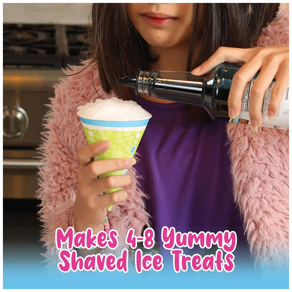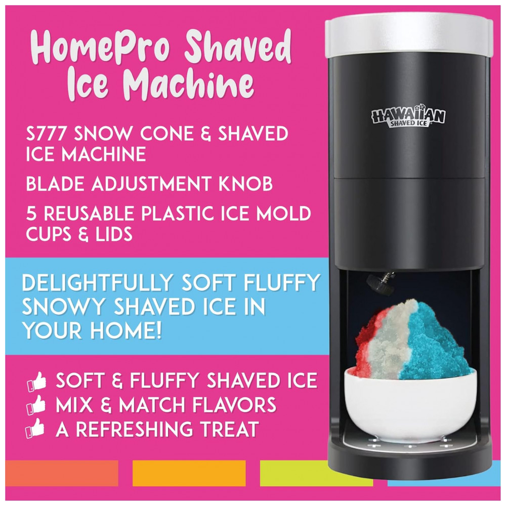 Inclui 1 máquina de fazer gelo raspada HomePro, 3 garrafas de xarope de cone de neve, 25 xícaras, 25 canudos e 3 cavilhas