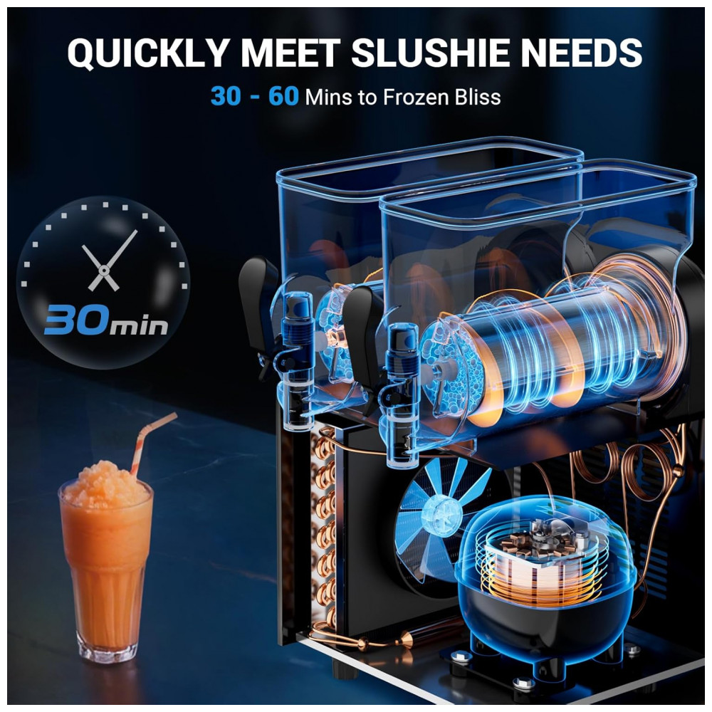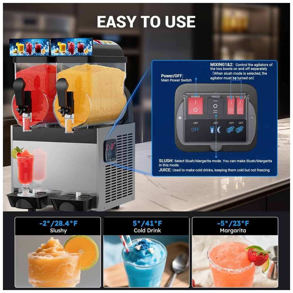 Desempenho de Resfriamento de Grau Comercial impulsionado por um compressor de cobre puro e engenharia de baixo ruído, esta máquina de frozen comercial oferece resfriamento rápido em 10-45 minutos, mantendo níveis de ruído abaixo de 40dB. Garante produção rápida e contínua sem prejudicar o ambiente de negócios. Modos Versáteis para Uso de Alta Demanda. Três modos de operação – Frozen, Margarita e Bebida Gelada – oferecem consistência ajustável para atender diversas preferências de clientes. Esta máquina de margarita comercial é ideal para bares, cafés, restaurantes e eventos que requerem rapidez e qualidade em larga escala. Construção Durável com Prevenção de Vazamentos. Projetada para uso diário intensivo, a máquina de frozen comercial apresenta um corpo de aço inoxidável, tanques de PC de qualidade alimentar e uma tampa superior de ABS. Vedações à prova de vazamentos e componentes destacáveis garantem tempo de inatividade mínimo e fácil limpeza – construída para operar sob pressão. Dois Tanques de 15 Litros com LED. Sirva dois tipos de bebidas simultaneamente com tanques separados de 15 litros – ideal para ampliar a variedade em espaços limitados. Esta máquina de frozen comercial inclui iluminação LED integrada para destacar as bebidas e melhorar o apelo visual, impulsionando o engajamento e as vendas.