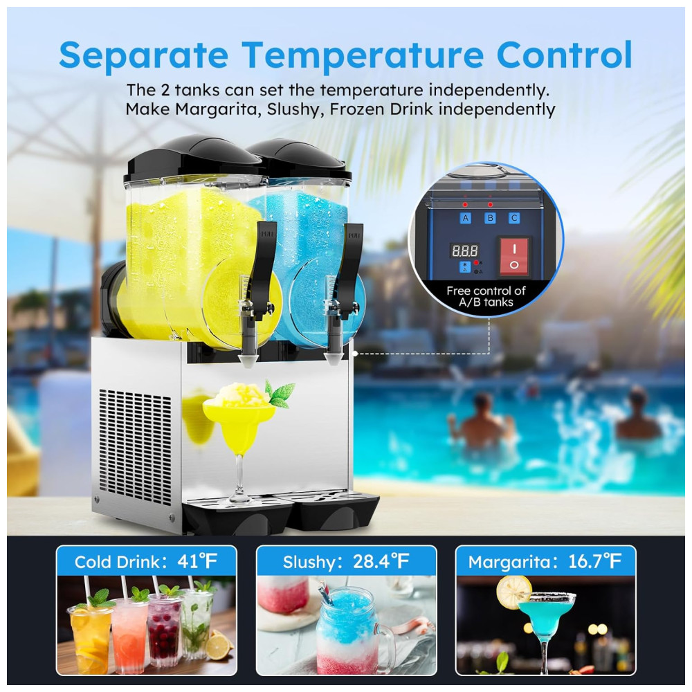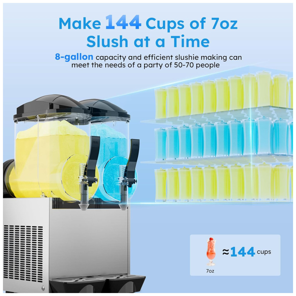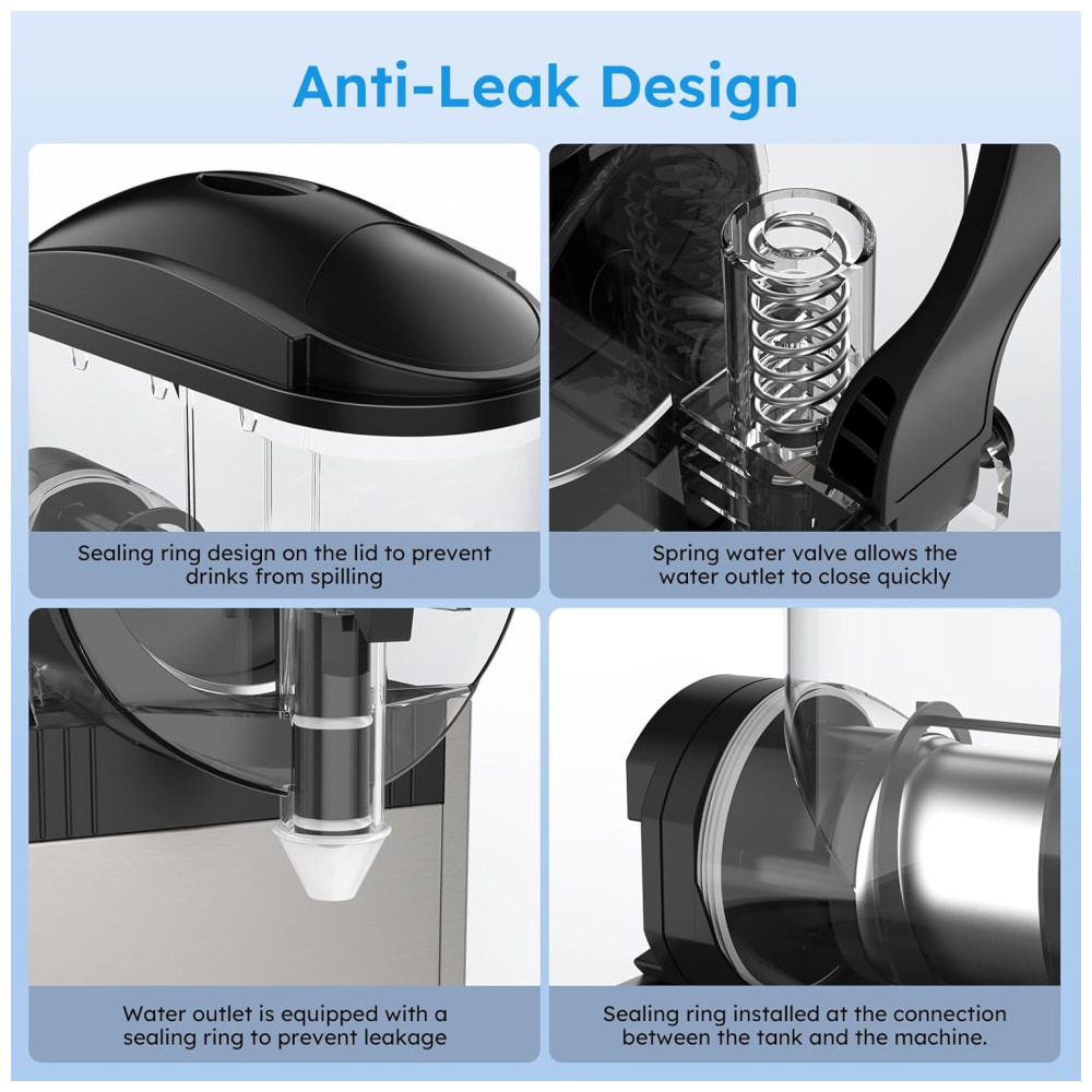 Essa máquina de margarita oferece uma grande capacidade de 30 litros (8 galões), o que equivale a aproximadamente 144 copos (200 ml por copo) de deliciosas margaritas, raspadinhas ou bebidas congeladas, ideal para festas ou necessidades comerciais. Cada lacuna da máquina é efetivamente à prova de vazamentos, evitando problemas de limpeza causados por derramamentos.