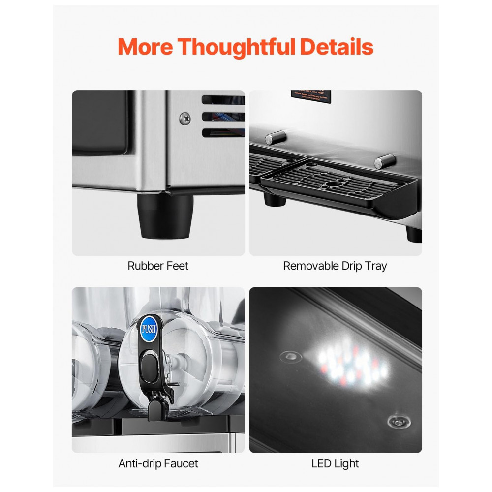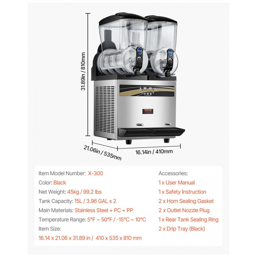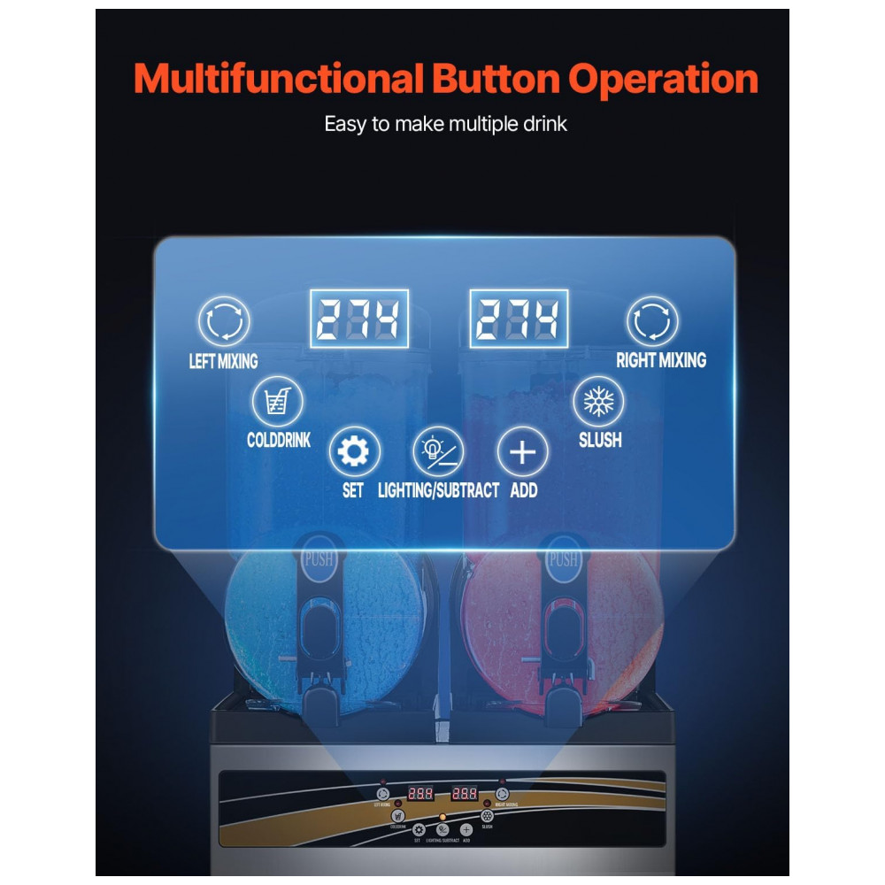 A máquina de margarita comercial VEVOR é perfeita para preparar uma variedade de bebidas, desde sucos e chás até margaritas e cafés gelados. Com dois tanques de 15 litros, pode fazer cerca de 120 copos de bebidas congeladas por lote. A temperatura ajustável permite controlar a consistência das bebidas, sendo ideal para bebidas sem álcool ou alcoólicas. Feita com corpo de aço inoxidável e tanque de PC seguro para alimentos, é durável e fácil de limpar. Além disso, possui configurações independentes para os tanques, painel de controle intuitivo, limpeza automática, e design que facilita a dissipação de calor, oferecendo estabilidade e eficiência.