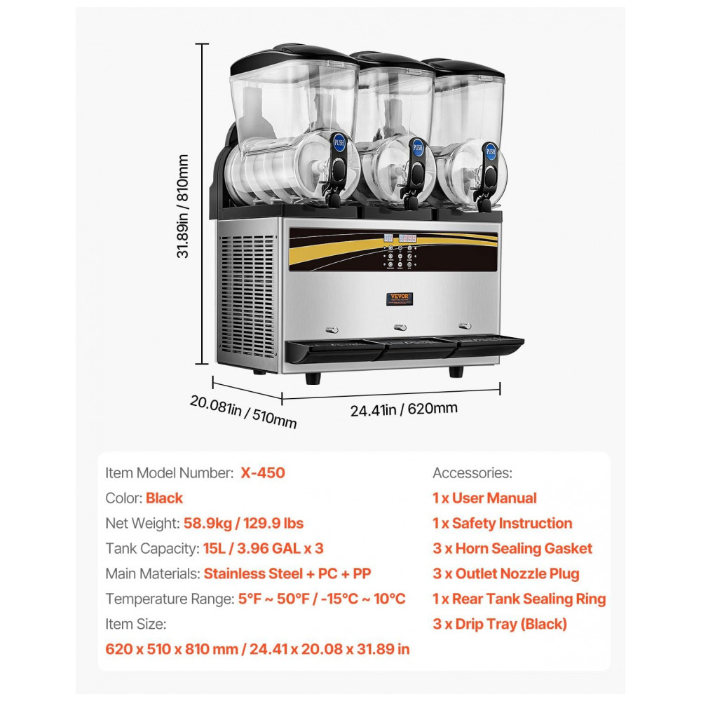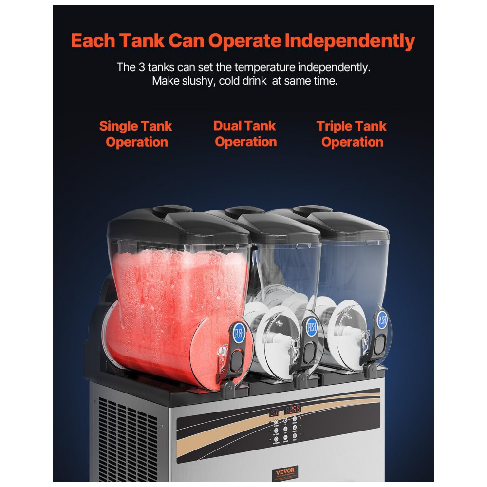 Desfrute de uma variedade de bebidas com a máquina de margarita comercial VEVOR! Com temperatura ajustável de 5°C a 50°C, você pode controlar a consistência das suas bebidas. Com capacidade para 180 copos por lote, graças aos três tanques de 15L. Operação fácil com painel intuitivo, limpeza simples e durabilidade garantida com corpo de aço inoxidável. Ideal para bares, cafés, restaurantes e festas em casa.