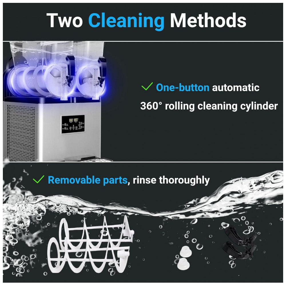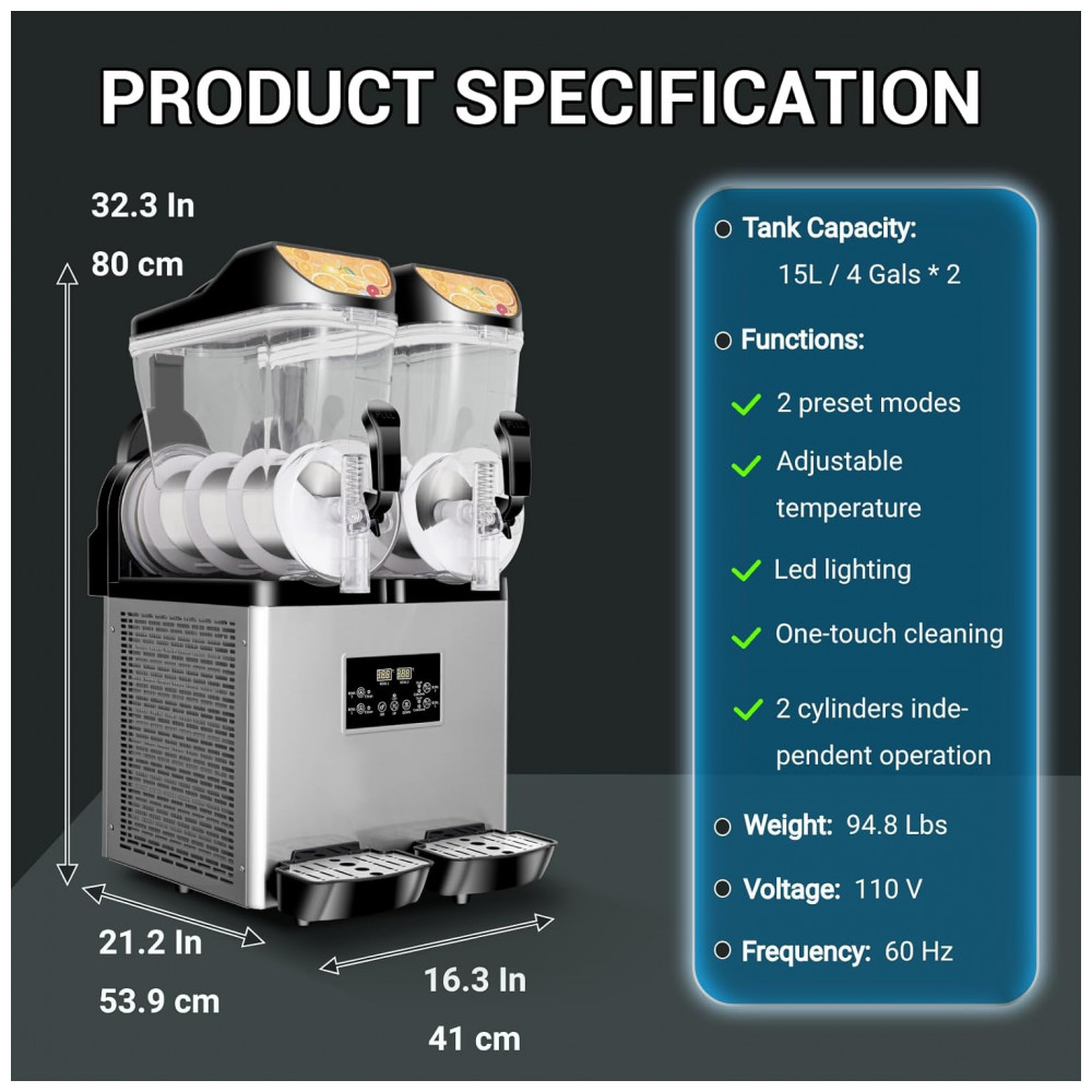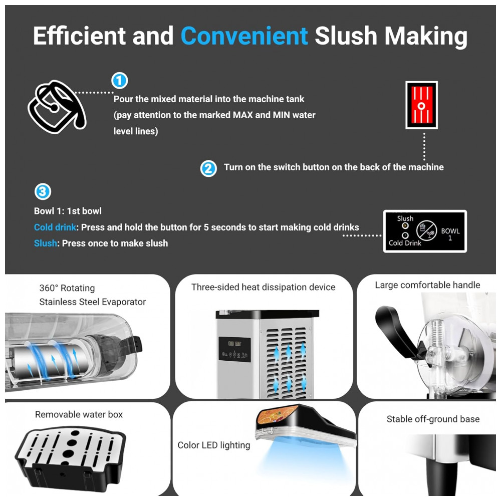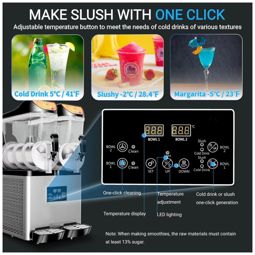Desfrute de bebidas geladas com a Máquina de Frozen Drink Comercial de 30 litros (8 galões), que produz aproximadamente 144 copos de bebidas congeladas por enchimento. Com tecnologia de resfriamento sem gelo, garante uma saída constante de bebidas durante os períodos de alta demanda. Ideal para bares, restaurantes, festas e outros locais movimentados. Produza uma variedade de bebidas, como margaritas, coquetéis, vinhos e refrigerantes em dois tanques independentes. Design à prova de vazamentos facilita a limpeza, com partes destacáveis e corpo de aço inoxidável de fácil limpeza. Opere facilmente com 2 modos pré-definidos e controle de temperatura ajustável. Iluminação LED integrada para visibilidade das bebidas. Marca: BOSBAK.