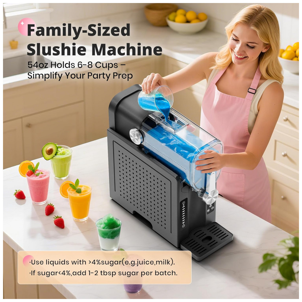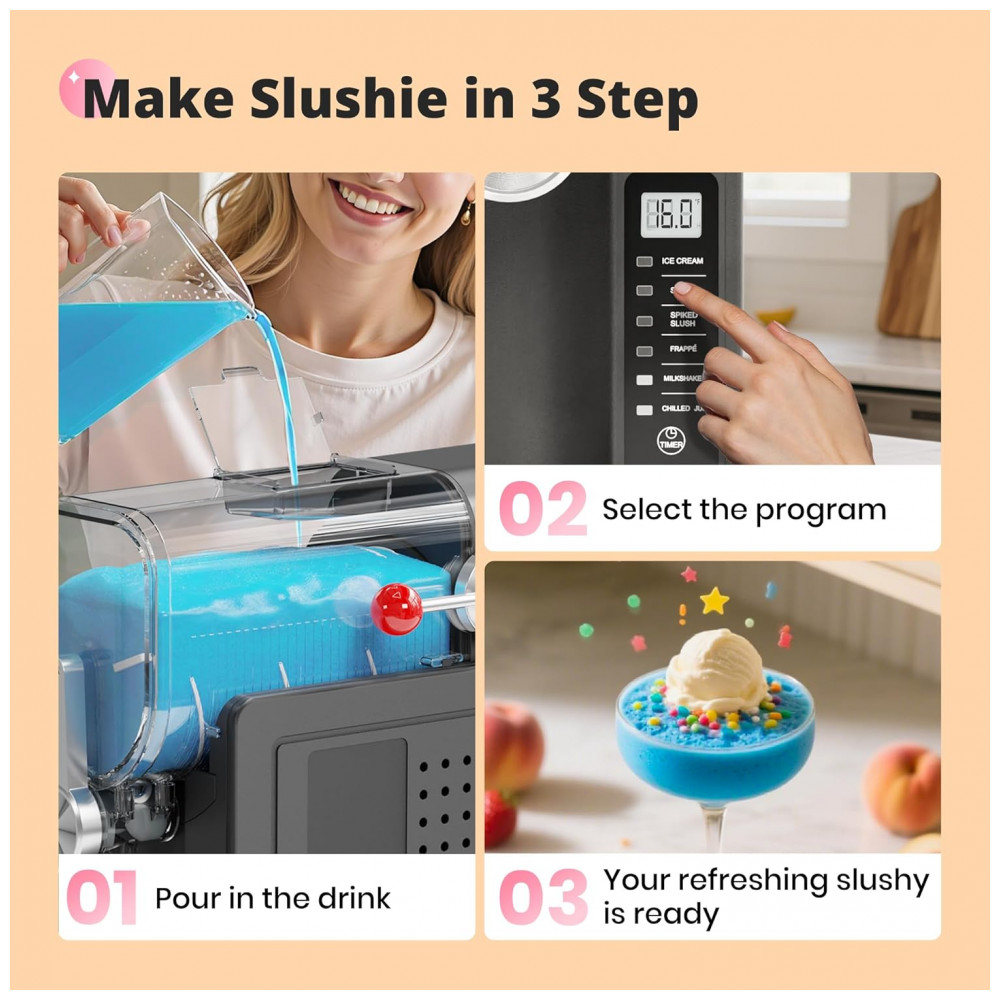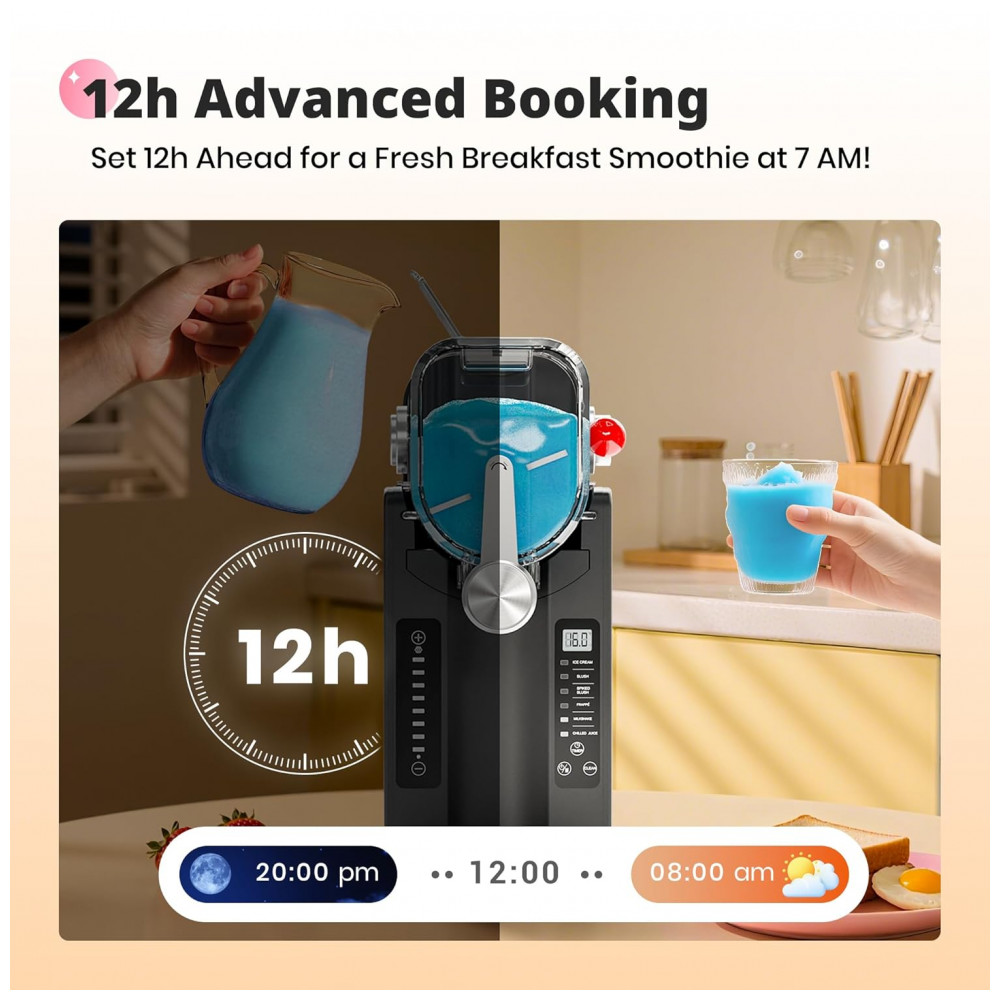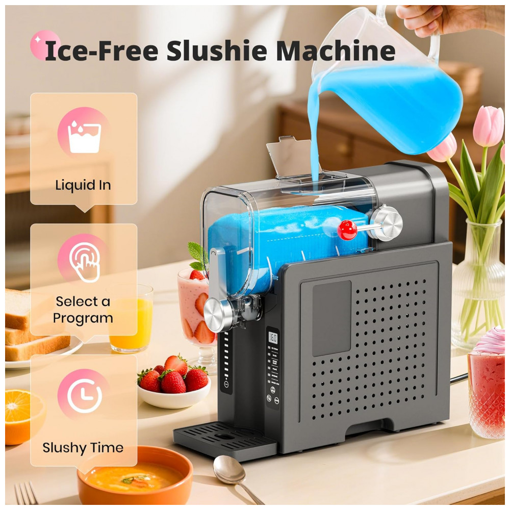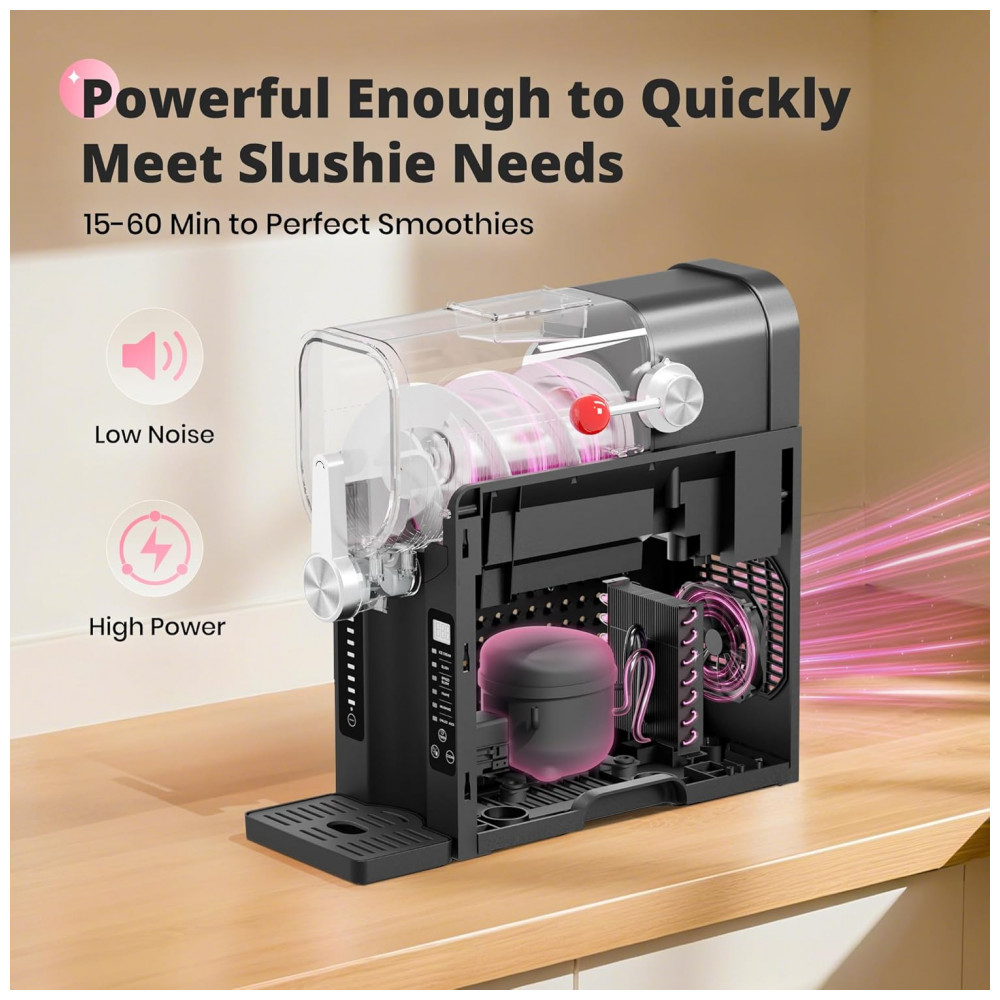 Desfrute da simplicidade da nossa Máquina de Frozen sem Gelo! Sem a necessidade de gelo, sem complicações. Com um compressor silencioso de alto desempenho e tecnologia avançada de congelamento instantâneo, transforma sucos, café ou vinho em frozen suave instantaneamente – sem a necessidade de pré-resfriamento. A limpeza é rápida, dando-lhe mais tempo para relaxar. Perfeito para momentos rápidos ou festas, proporciona bebidas de qualidade de restaurante em casa. A tela de LED amigável permite ajustar a temperatura com precisão. Com 6 programas predefinidos, você pode criar suas bebidas favoritas sem esforço. Agende as bebidas com até 12 horas de antecedência, graças ao timer integrado. Com capacidade para 1,6 litros, é ideal para encontros familiares ou momentos com amigos. Adquira já a Máquina de Frozen EZBASICS e torne-se um mestre na fabricação de bebidas deliciosas!