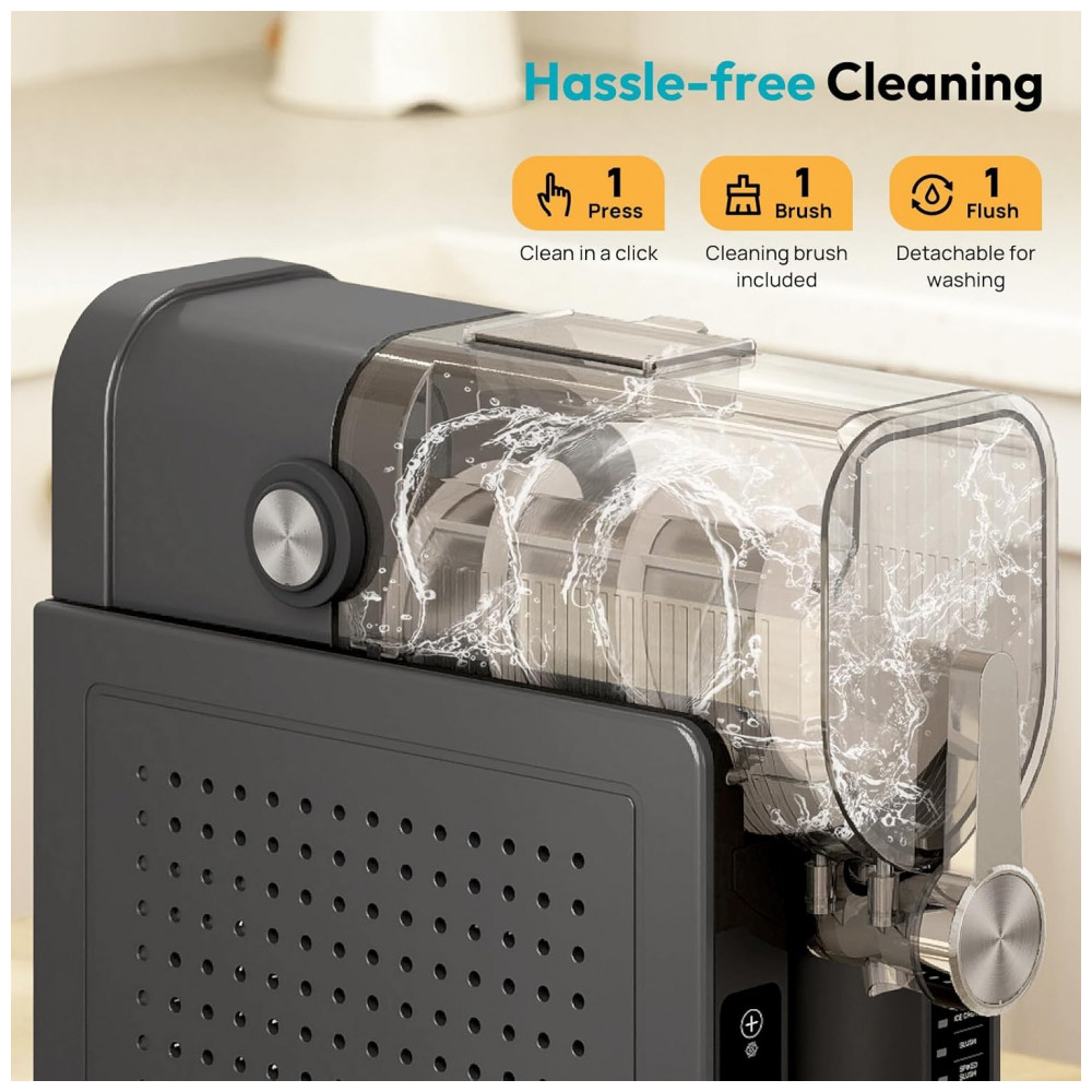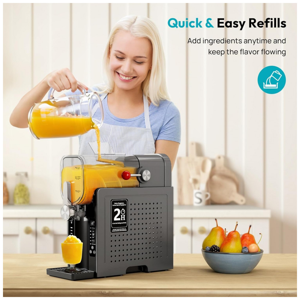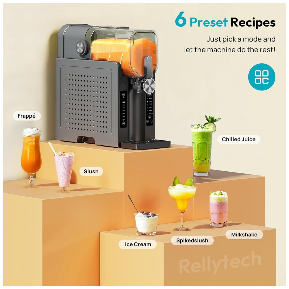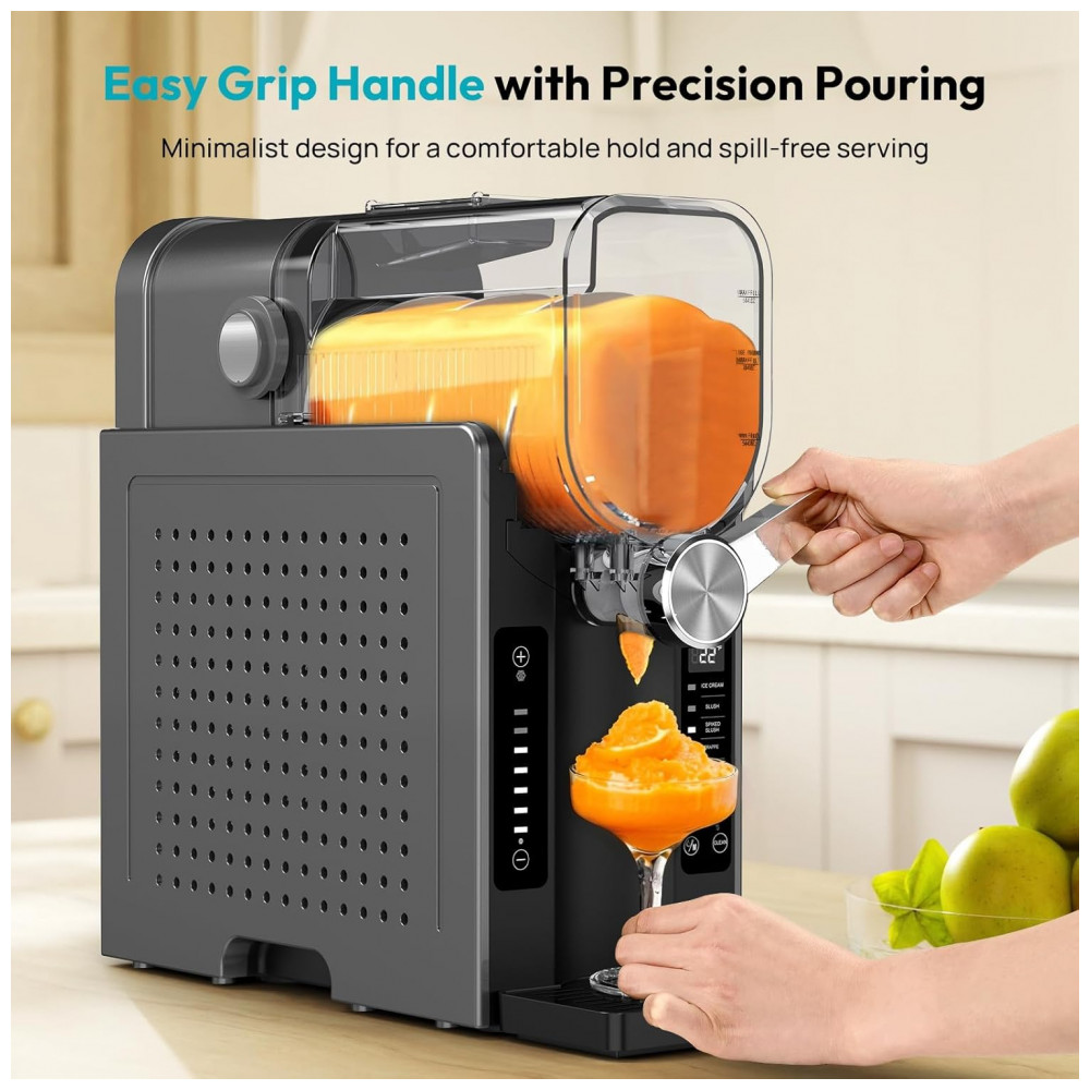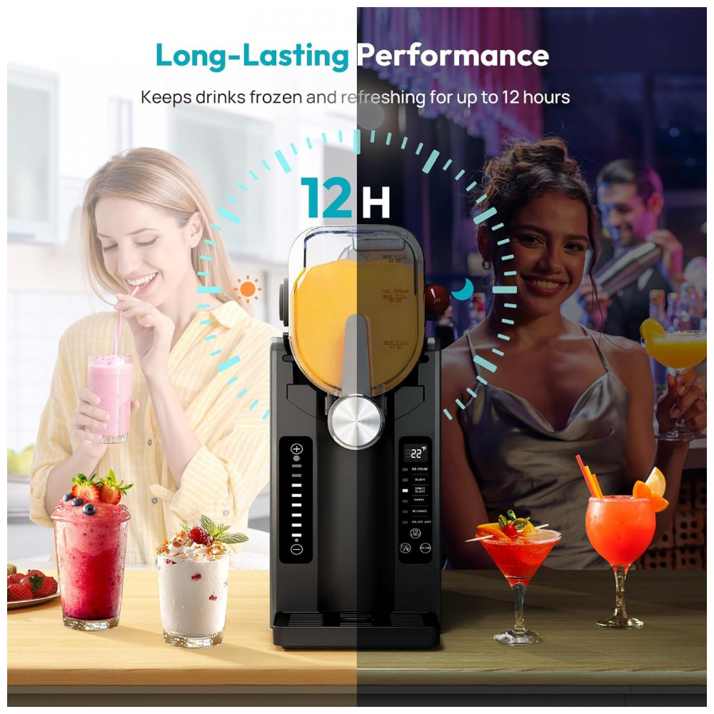 Com o modo de Criação de Bebidas 6 em 1, esta máquina inteligente simplifica o processo para resultados de nível barista na sua cozinha. Crie raspadinhas, smoothies, frappés, coquetéis congelados, milkshakes e muito mais com apenas um toque. Desfrute de bebidas mais suaves, mais consistentes e mais espessas sem a necessidade de gelo ou mistura extra. O controle de resfriamento de 8 níveis e as lâminas giratórias 360° garantem uma textura de gelo perfeita, infusão de sabor mais profunda e uma delícia congelada em cada gole. Compacta e versátil, esta máquina de frozen com capacidade de 1,6L se encaixa perfeitamente em balcões modernos, produzindo até 12 copos por vez. Além de ser ideal para encontros familiares, festas informais, pausas no escritório, mimos em dormitórios e rituais diários de refrescância, também é um presente perfeito para o verão. Limpeza fácil com um toque, peças removíveis que podem ir à lava-louças e escova de limpeza garantem uma limpeza sem complicações. Desfrute de até 12 horas de operação contínua à prova de vazamentos. Adicione ingredientes a qualquer momento durante o ciclo com confiança, graças ao design à prova de vazamentos que garante uma mistura sem bagunças, manuseio mais seguro e menos tempo de limpeza. Atenção: certifique-se de que o teor de açúcar seja acima de 4 e o teor alcoólico em bebidas alcoólicas esteja entre 2,8 e 16. Antes de despejar a mistura no recipiente, mexa bem. Não adicione cubos de gelo, ingredientes sólidos ou líquidos quentes.