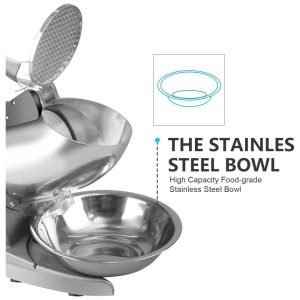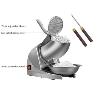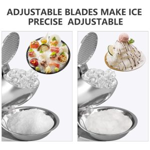 304 MATERIAL DE AÇO INOXIDÁVEL O triturador de gelo adota lâminas de aço inoxidável não corrosivas de grau alimentício e tigelas de gelo para garantir uma vida útil mais longa. As condições anti ferrugem e sanitárias garantem a segurança alimentar