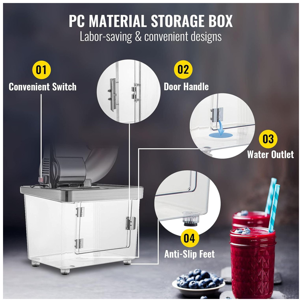 Caixa de grande capacidade Esta máquina criadora de bolas de neve adota uma caixa de zenamento de PC moldada por injeção de uma peça, que pode conter cerca de 34L 9 galões de gelo raspado. O material espessado manterá o gelo da neve congelado por um longo tempo. Além disso, o triturador de gelo é equipado com uma mangueira de drenagem, que drena o excesso de água e evita que a água vaze nas superfícies.