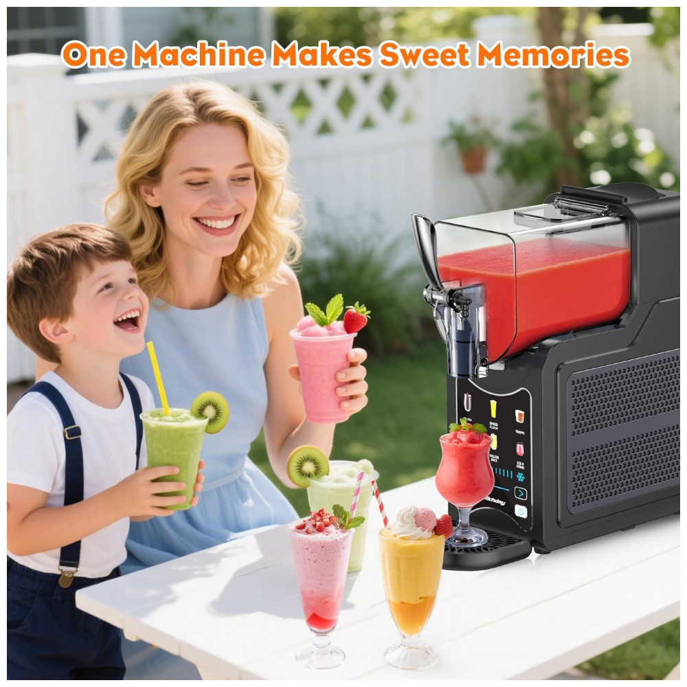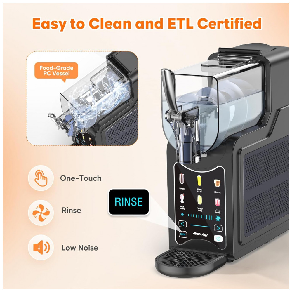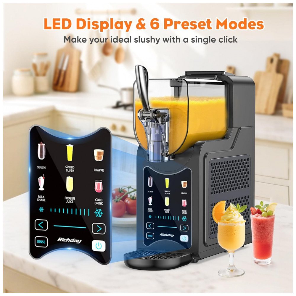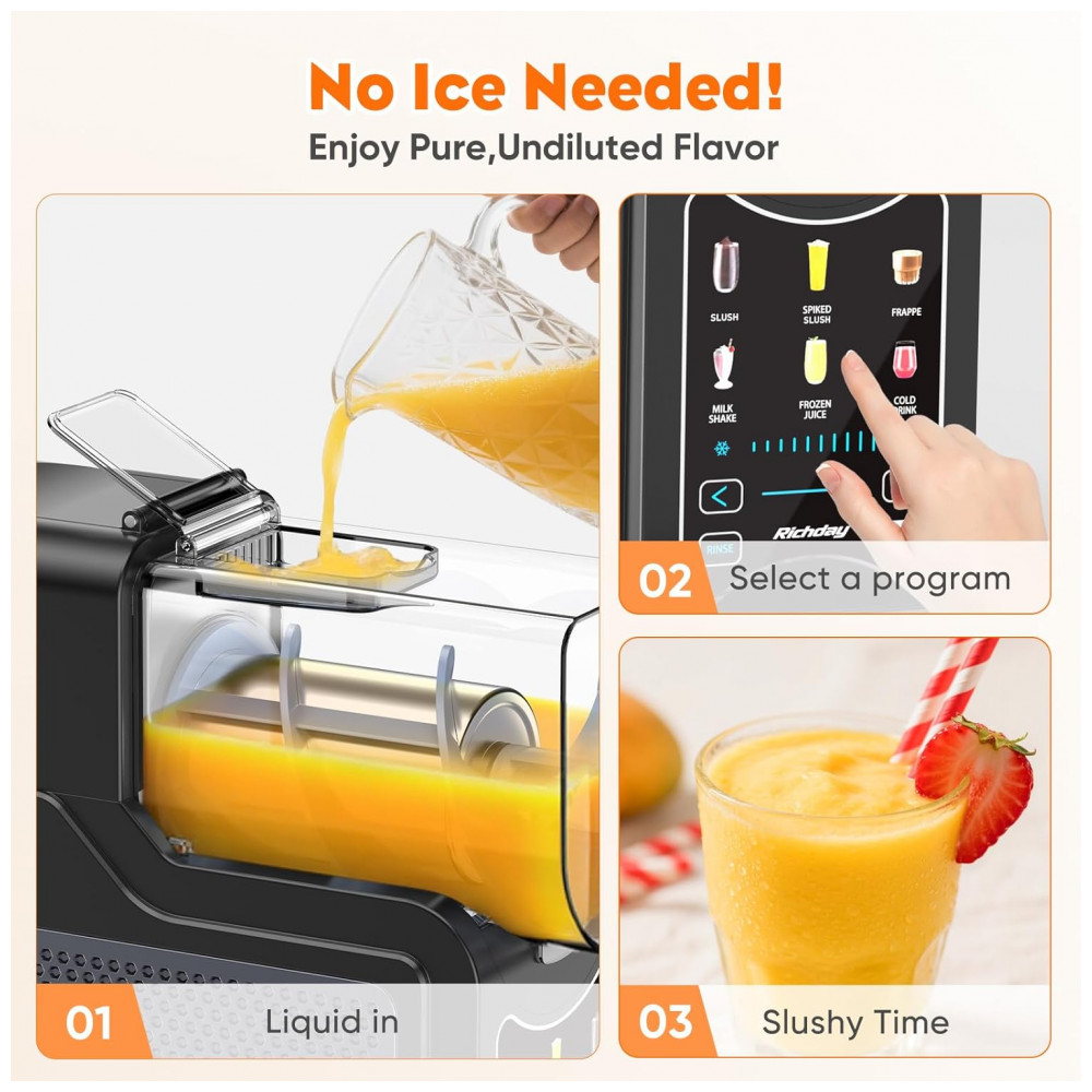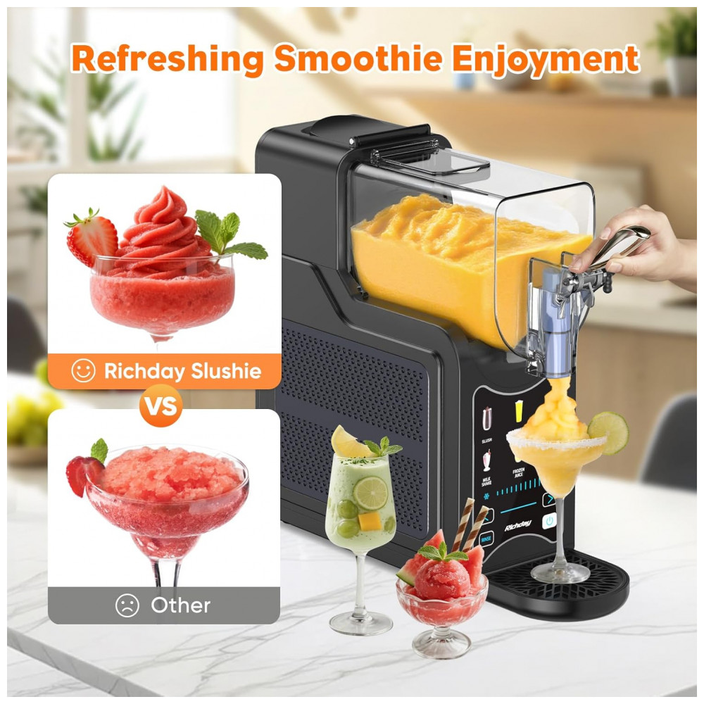 Desfrute de bebidas geladas perfeitamente misturadas em casa, sem a necessidade de gelo, graças à Tecnologia de Resfriamento Rápido exclusiva da Richday. Com 6 modos programados, como Frozen, Frappé, Milkshake e mais, basta despejar suco, refrigerante, café ou coquetéis, apertar um botão e em apenas 15-45 minutos saborear smoothies e bebidas geladas. Cada gole mantém o sabor autêntico. Com capacidade de 2,6 litros, atende tanto a momentos tranquilos quanto a festas. A função de autolimpeza em 3 minutos e materiais livres de BPA tornam a limpeza fácil e segura.