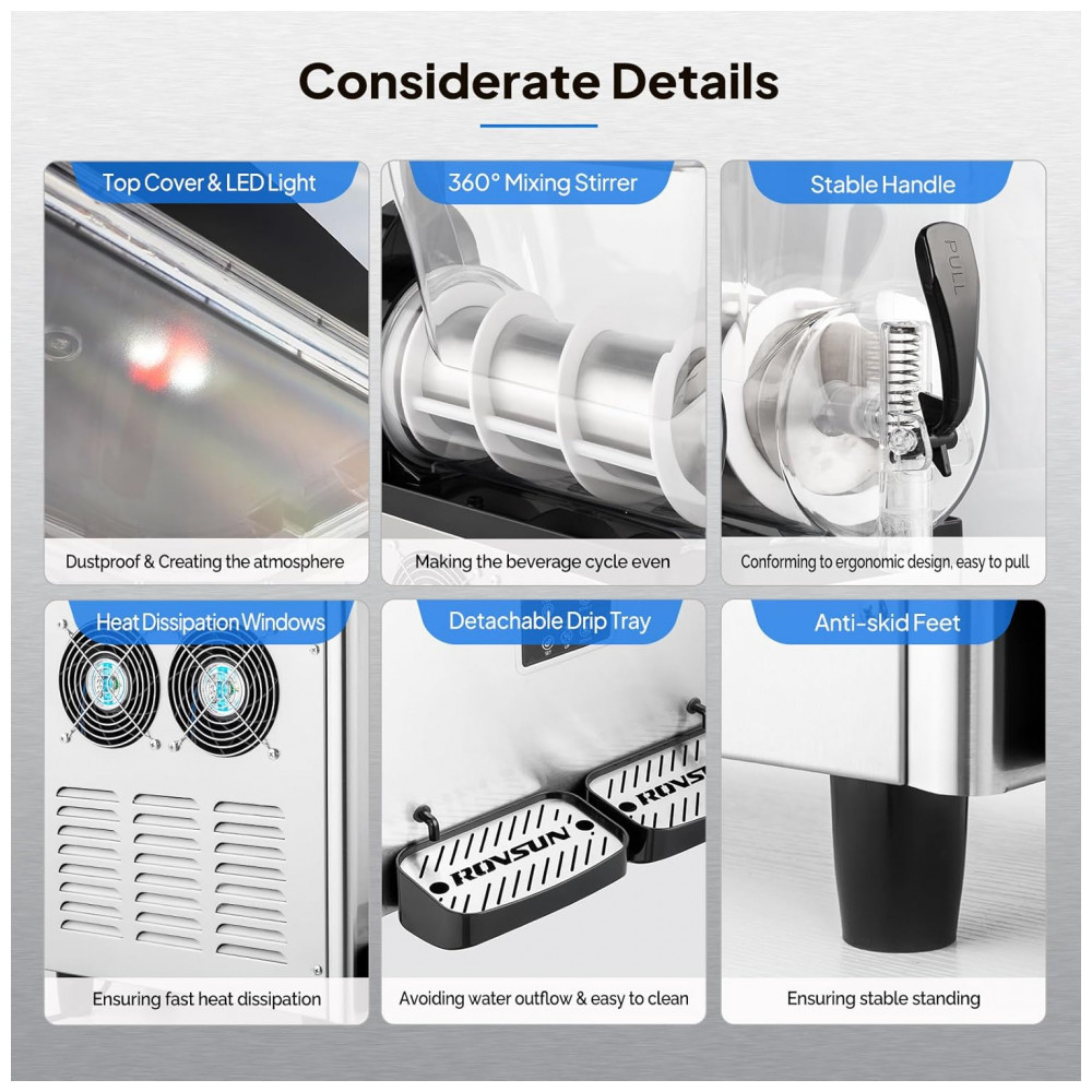 A Máquina de Frozen ROVSUN é perfeita para uso residencial e comercial. Feita com material de aço inoxidável 304 e material PC para garantir a segurança alimentar e proteger sua saúde. Compressor premium com fios de cobre torna a produção de frozen mais eficiente. Possui capacidade de 15 litros, ideal para fazer margaritas, frozen e outras bebidas geladas. Fácil de limpar, operar e armazenar. Leve agora e desfrute de deliciosas bebidas geladas em sua casa ou estabelecimento!