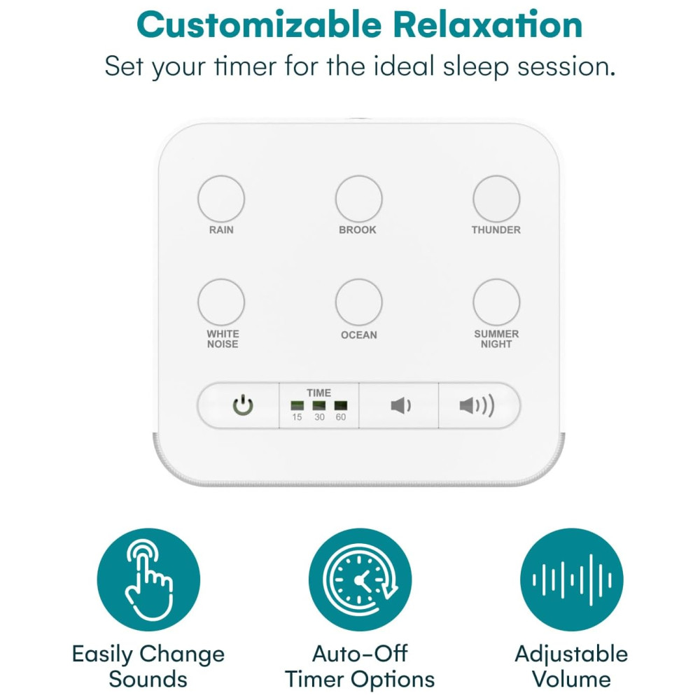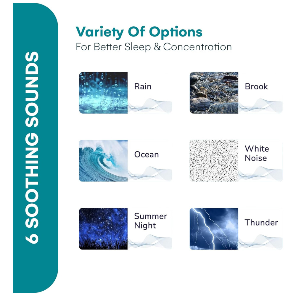 Seis sons suaves do sono Os seis sons da máquina de ruído branco incluem chuva, riacho, oceano sem gaivotas, trovão, ruído branco e noite de verão. Os sons da máquina de dormir ajudam você a adormecer mais rápido e acordar se sentindo revigorado pela manhã