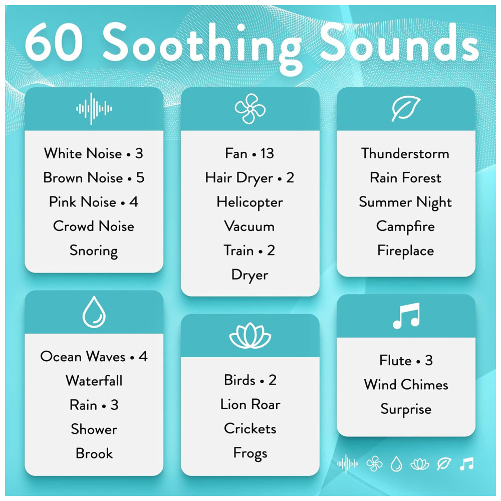 60 SONS DE CALOR 13 ventiladores, 5 ruído marrom, 4 ruído rosa, 3 ruído branco, 4 ondas do mar, 3 chuva, tempestade, riacho, chuveiro, cachoeira, floresta tropical, noite de verão, grilos, sapos, 2 pássaros, helicópteros, 2 secador de cabelo, secador, multidão, 2 trem, lareira, fogueira, 2 vácuo, ronco, surpresa, 3 flauta, rugido de leões e sinos de vento
