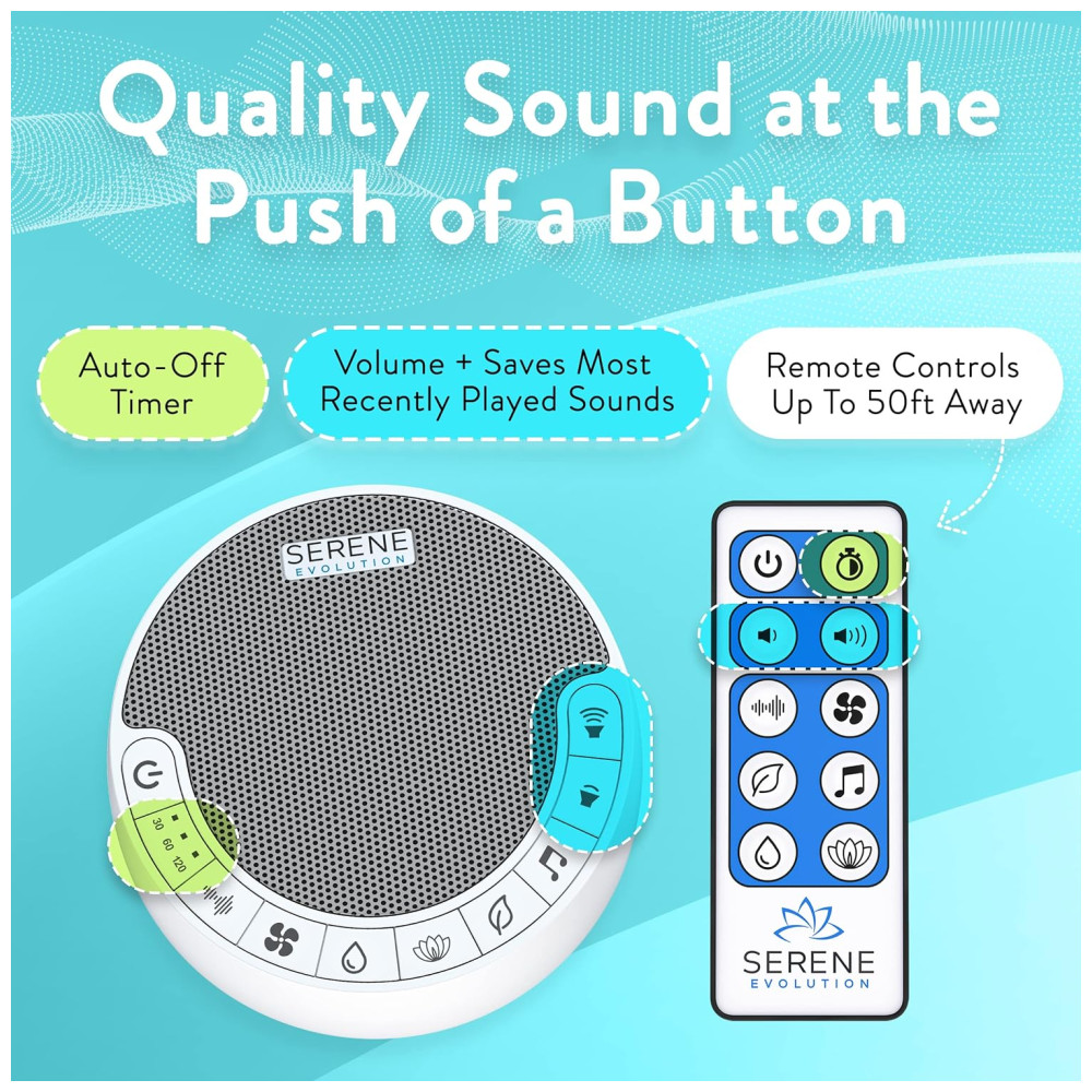 CONTROLE REMOTO SEM FIO Esta máquina de som Serene Evolution tem botões sensíveis ao toque na unidade e vem com um controle remoto que funciona a até 50 pés de distância.