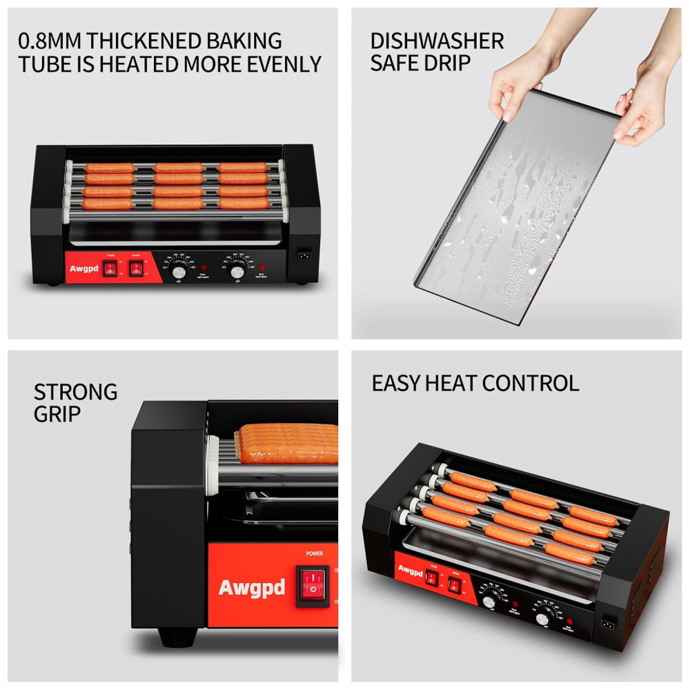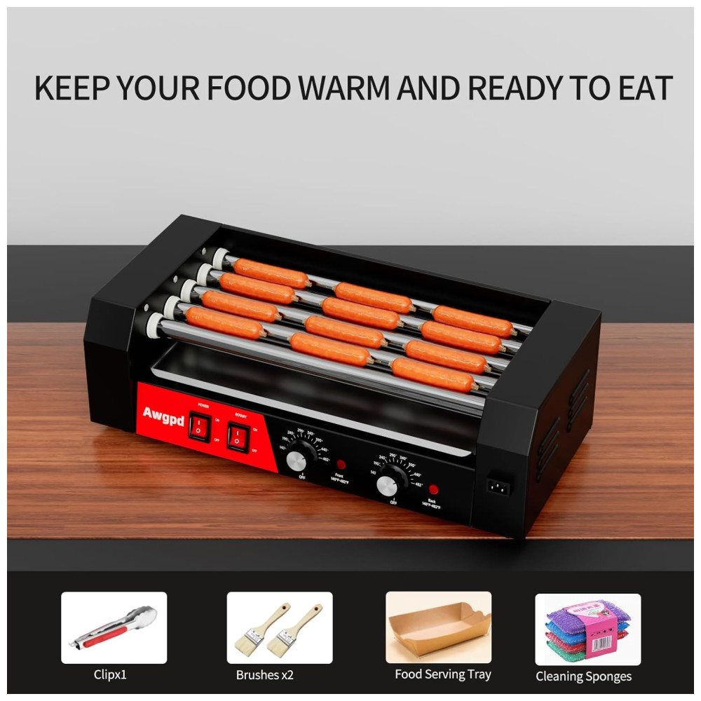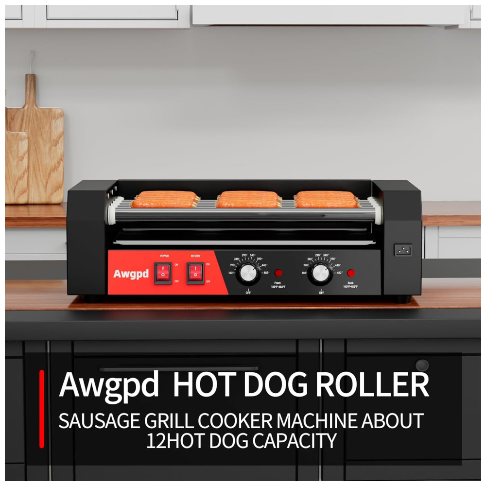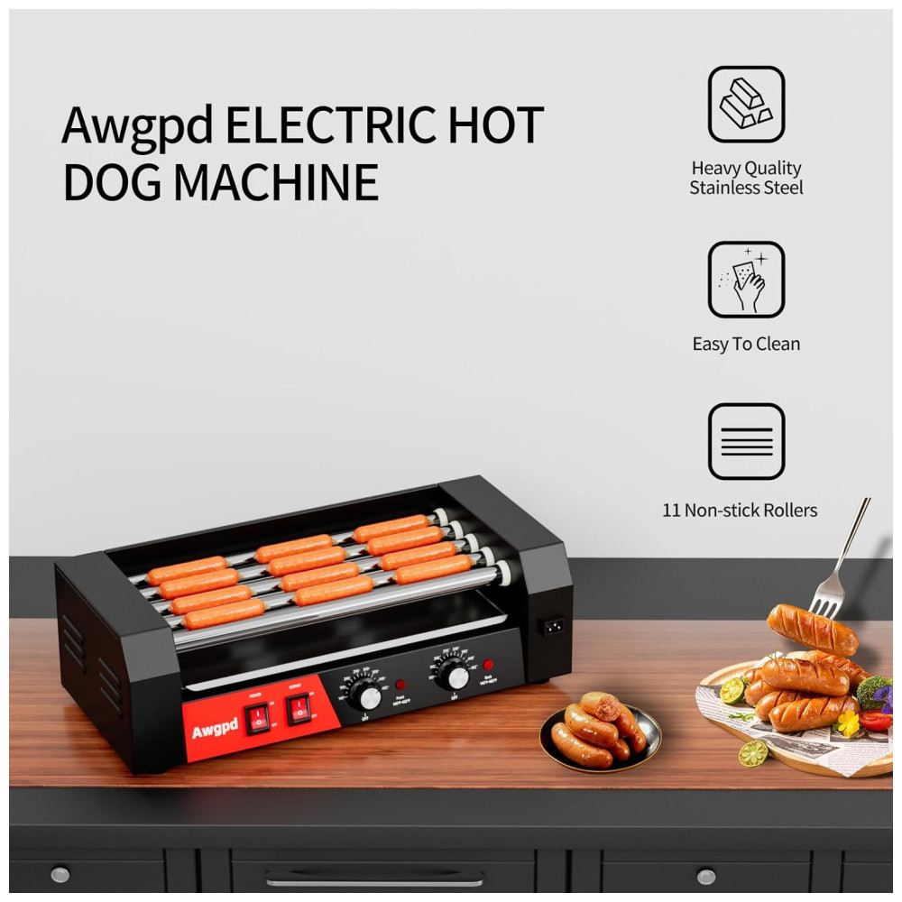 Máquina de Salsicha e Hot Dog Awgpd Grill 5 rolos capacidade para 12 hot dogs 750W controle de temperatura duplo bandeja coletora removível