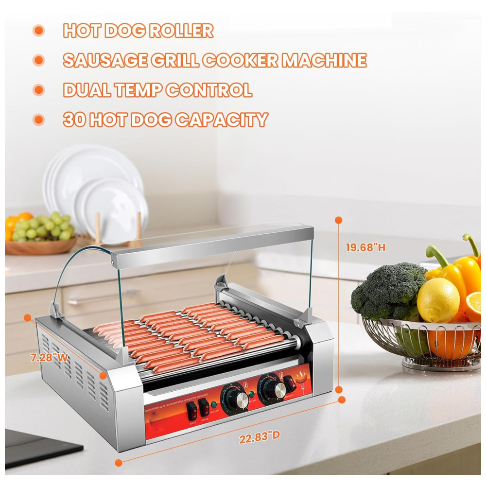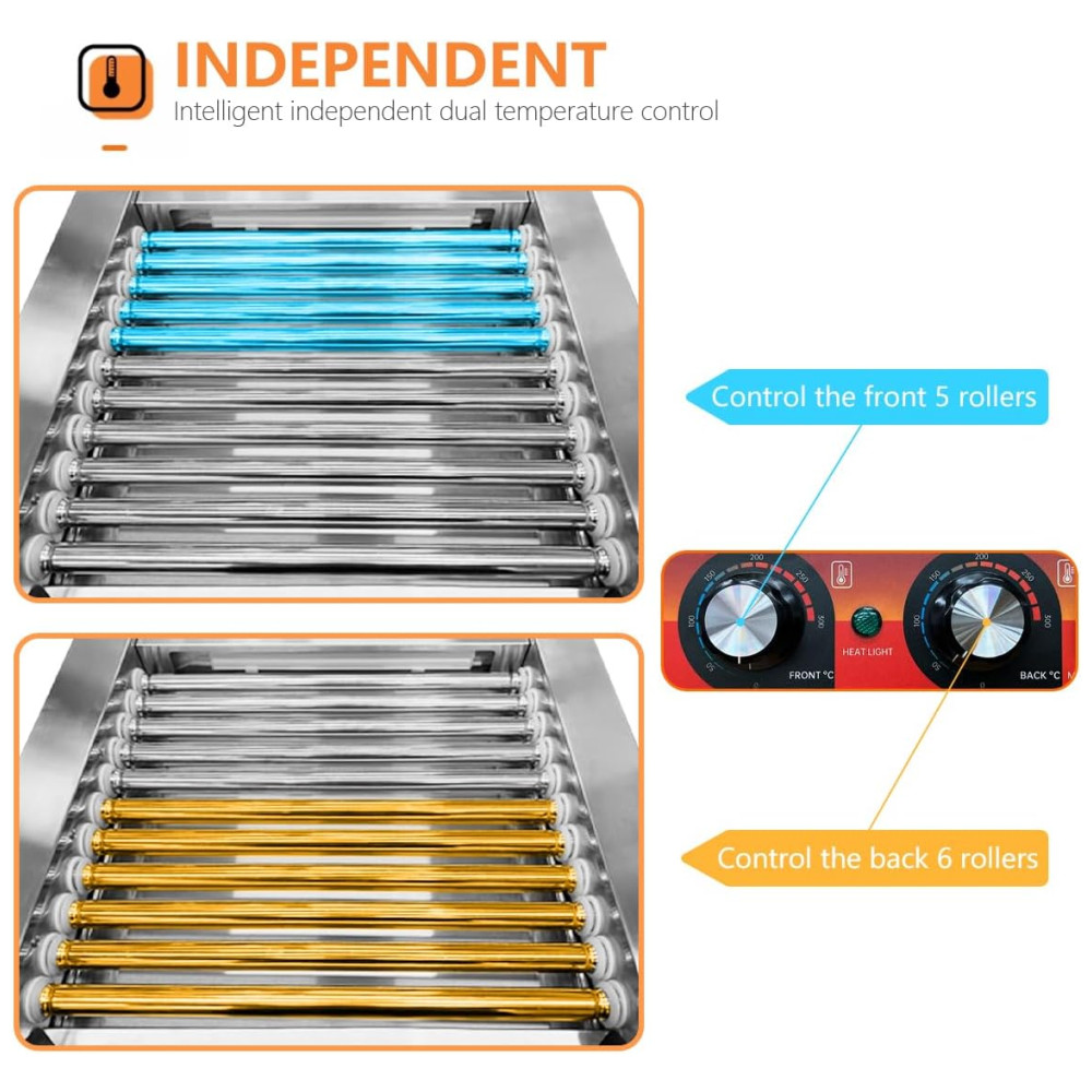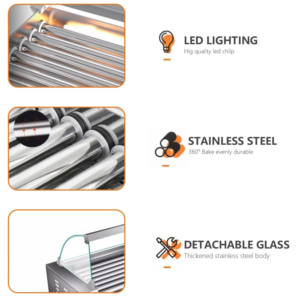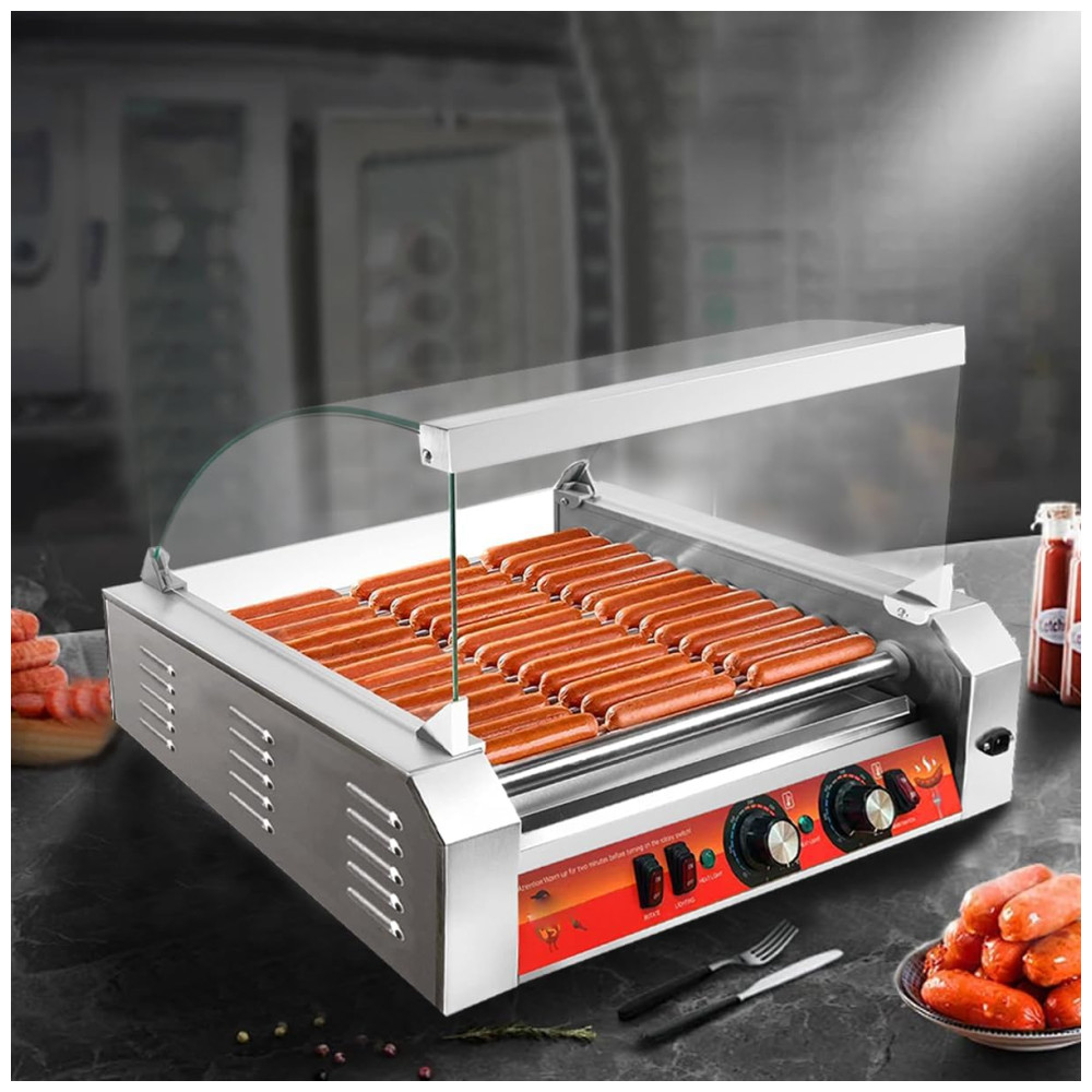 Nossa máquina de cachorro quente para grelhar é perfeita para uso comercial em balcões de fast food, lanchonetes, restaurantes, lojas de conveniência, padarias, festas e reuniões familiares. Com 11 rolos e um poderoso elemento de aquecimento de 1670 W, ela é capaz de grelhar até 30 cachorros quentes simultaneamente. Alimentos pré cozidos ou descongelados podem ser inseridos para aquecimento, enquanto o tambor da máquina gira lentamente 360 graus para garantir o aquecimento uniforme de cada cachorro quente.