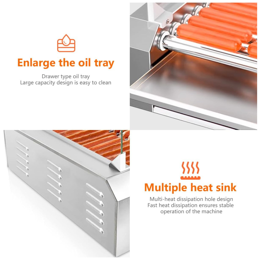 Além disso, nossa máquina de cachorro quente é fácil de limpar, com um tambor feito de material antiaderente de aço inoxidável 304 e uma bandeja coletora removível de aço inoxidável para coletar a gordura do cozimento dos cachorros quentes.