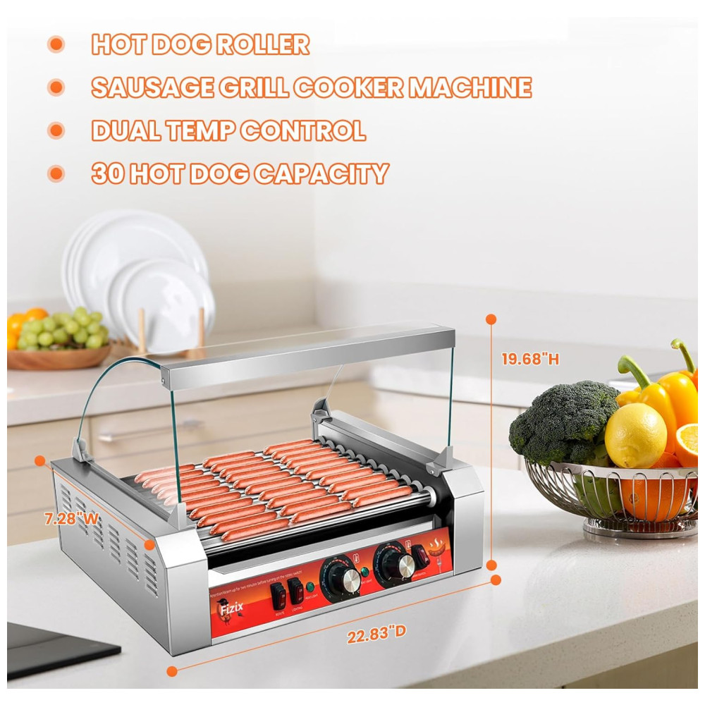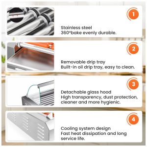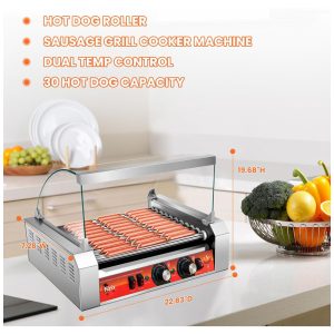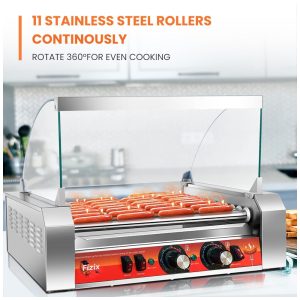 Nossa grelha para cachorro quente é uma máquina potente, projetada para uso comercial. Ela possui 11 rolos e um elemento de aquecimento de alta potência de 1670 W, permitindo que você grelhe até 30 cachorros quentes de uma só vez, sejam eles pré cozidos ou recém descongelados. A rotação lenta de 360 graus do tambor garante um aquecimento uniforme em cada item, resultando em uma comida deliciosa e consistente.