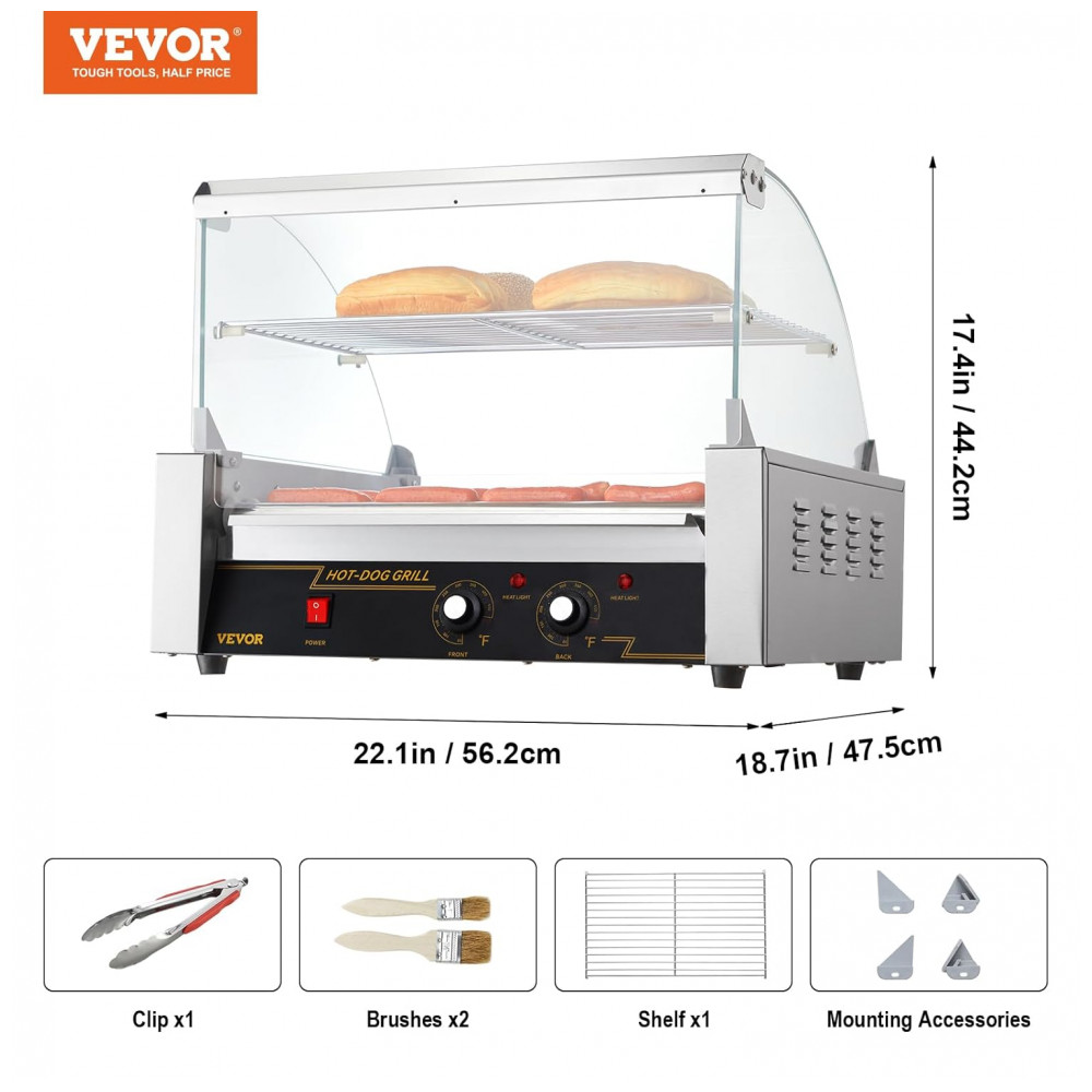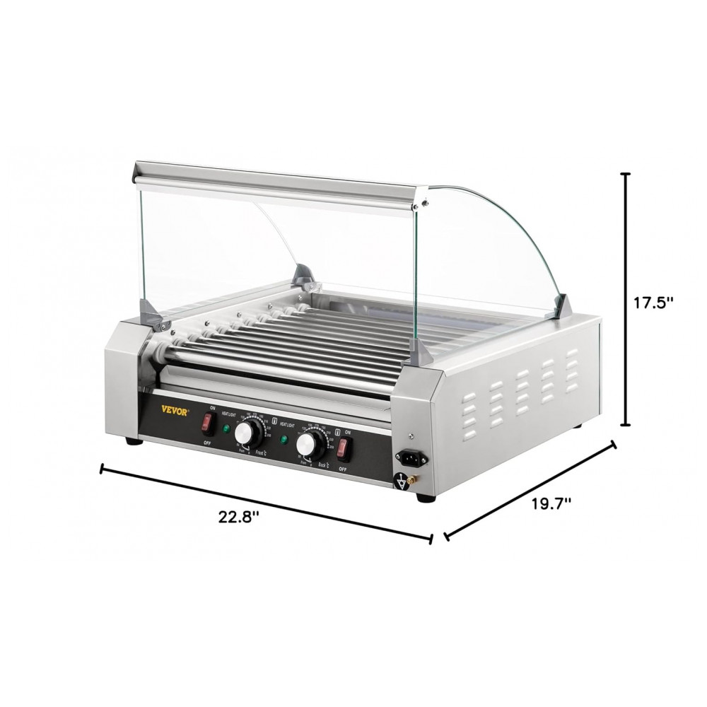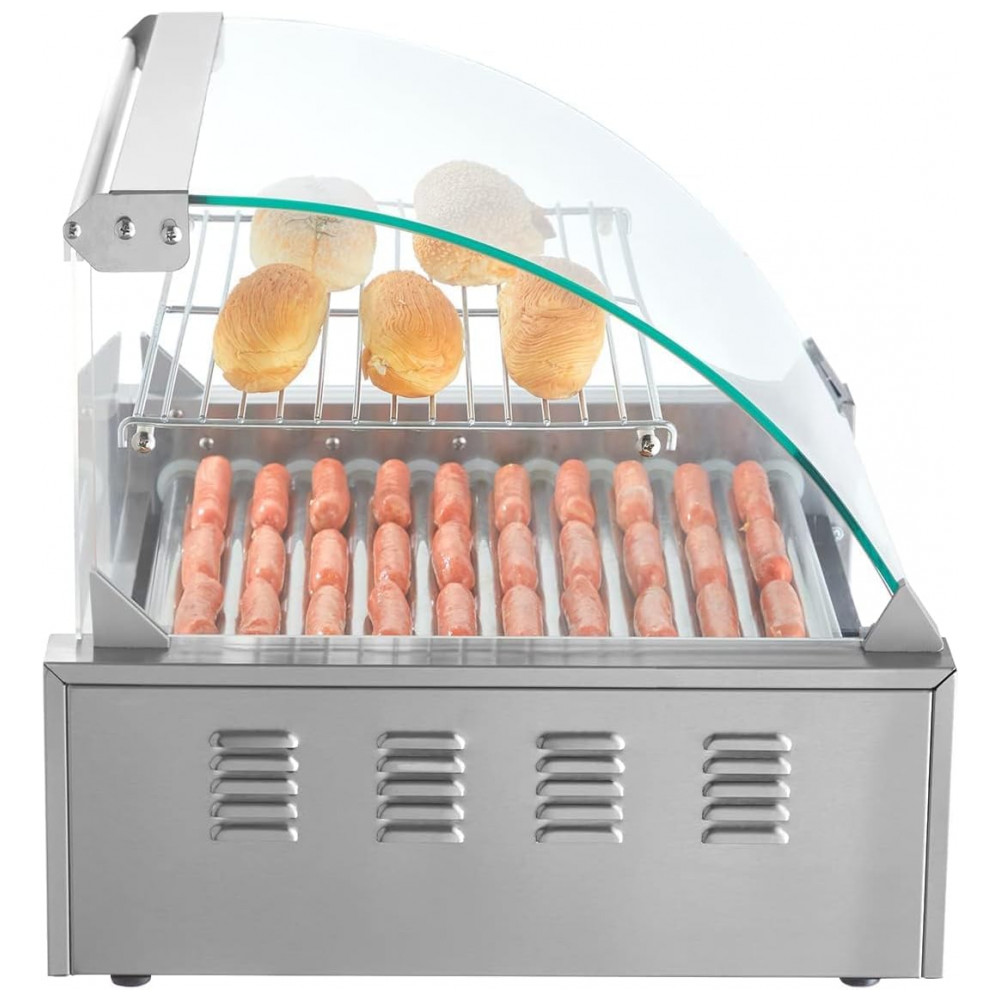 Máquina de Salsicha Profissional em Aço Inoxidável até 30 Unidades com Controle de Temperatura Duplo e Luz LED 1800W 110v VEVOR Hot Dog Machine 11 Rollers w Cover Prateado