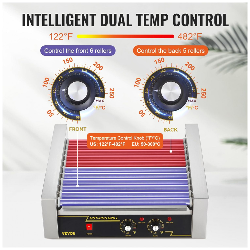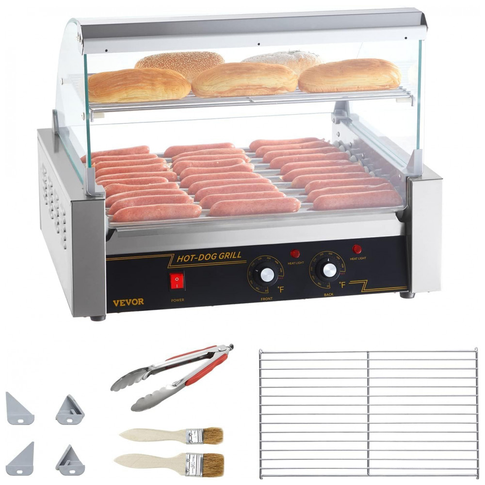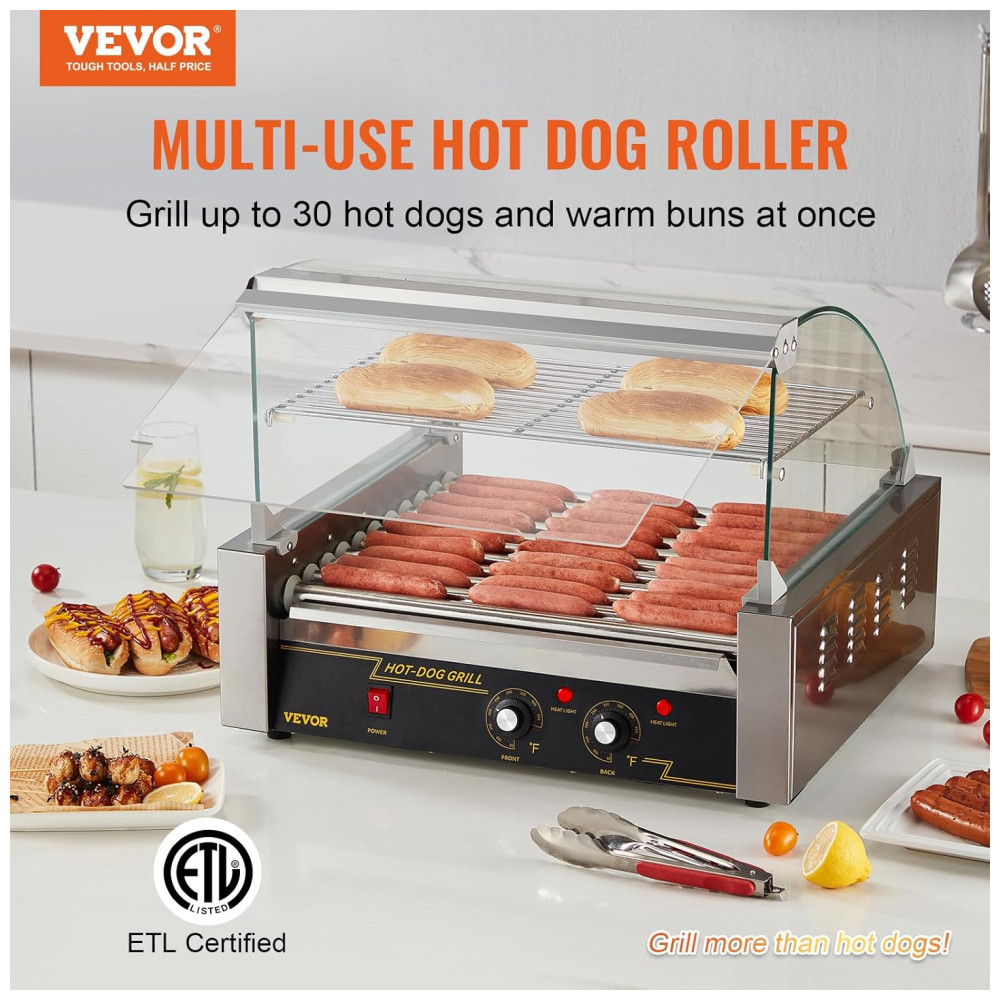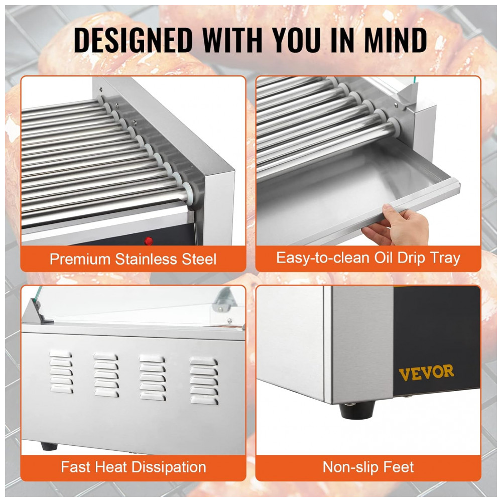 Máquina de Salsicha Profissional em Aço Inoxidável até 30 Unidades com Controle de Temperatura Duplo e Luz LED 1800W 110v VEVOR Hot Dog Machine 11 Rollers w Cover Prateado