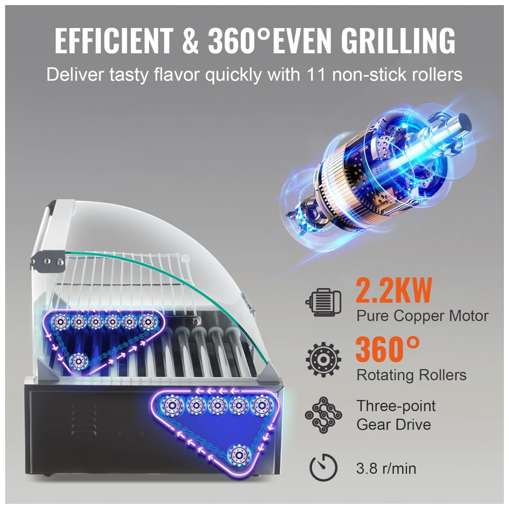 Rotação do rolo de 360 graus Com o design da corrente de três pontos, os rolos desta máquina de cachorro quente podem girar 360 graus para cozinhar todos os cachorros quentes uniformemente. Devido a este aquecimento uniforme, você não precisa mais se preocupar com alguns de seus cachorros quentes sendo queimados ou mal cozidos. Além disso, o potente motor de 1800 W oferece uma cozedura de alta eficiência para que possa desfrutar de cachorros quentes em 15 minutos.