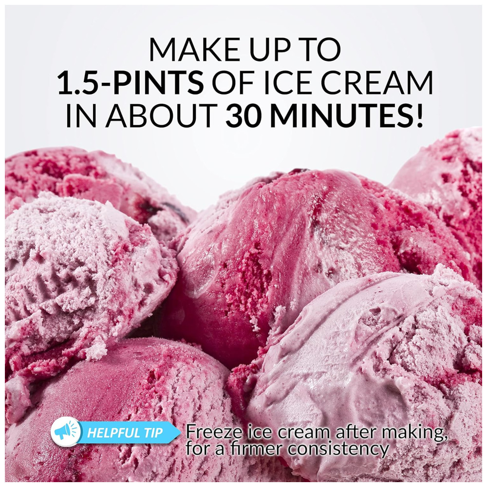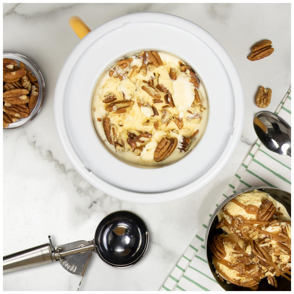 A máquina é rápida e fácil de usar, produzindo sorvete caseiro em apenas 20 minutos. Após a preparação, utilize a tampa incluída para armazenar o sorvete restante no congelador. A alça de transporte presa ao balde torna a máquina prática para levar a festas ou para a casa dos vizinhos.