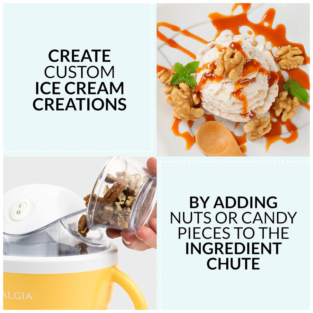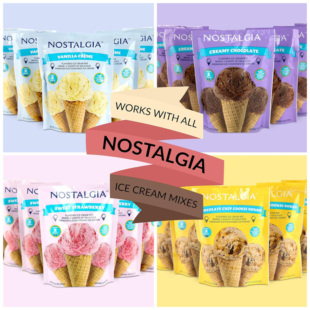 Prepare sorvetes, gelatos e mais com a Máquina de Sorvete Elétrica Nostalgia. Adicione seus ingredientes favoritos ao recipiente de alumínio, coloque-o no balde, adicione gelo e sal, e deixe o motor elétrico fazer o trabalho de agitação para você. Personalize suas receitas com conservas de morango, massa de biscoito, doces e pedaços de biscoito para criar sorvetes exclusivos e deliciosos.