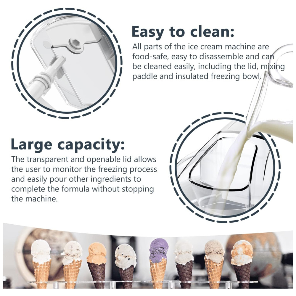Fácil de limpar Todas as peças da máquina de sorvete são seguras para alimentos, fáceis de desmontar e podem ser limpas facilmente, incluindo a tampa, a pá de mistura e a tigela de congelamento isolada