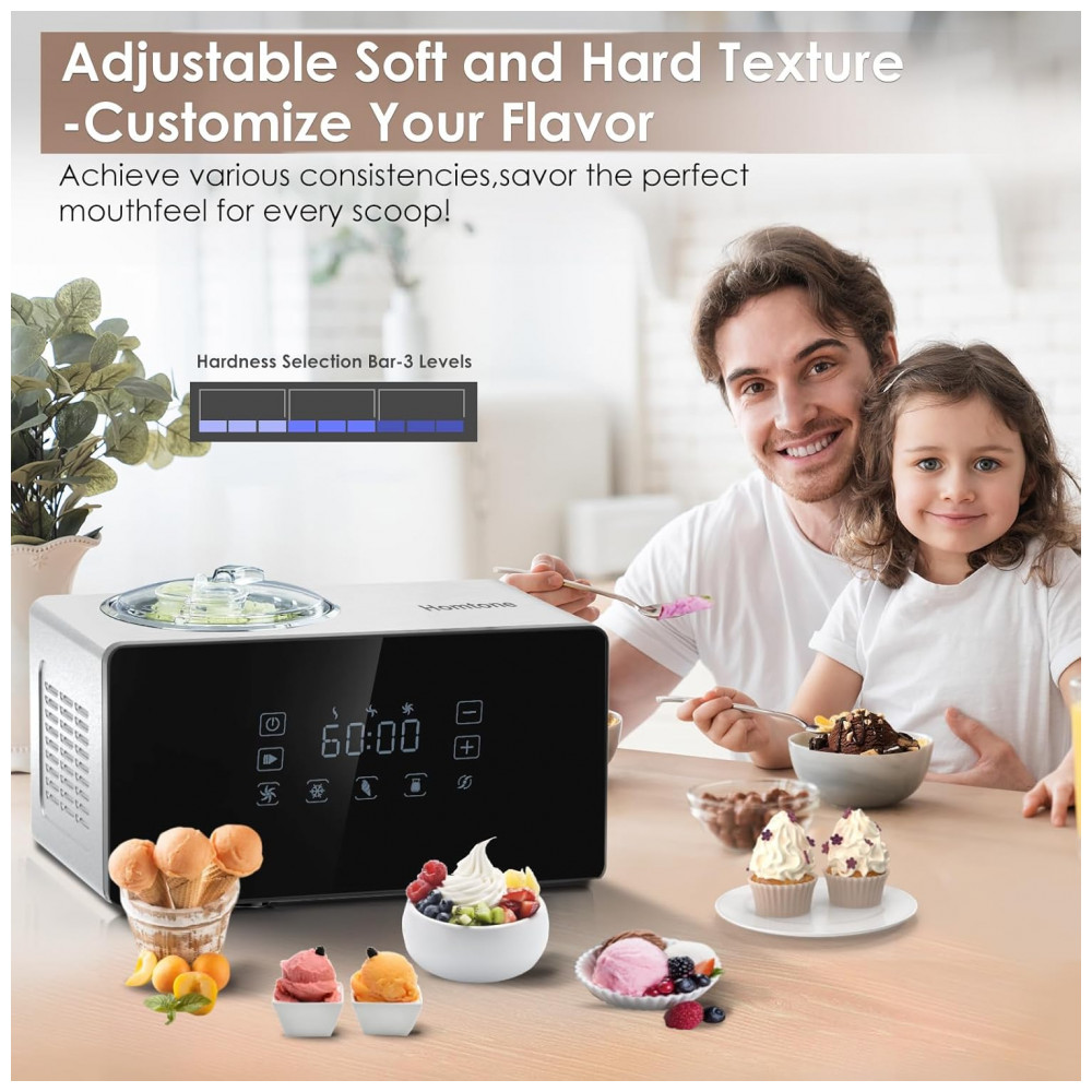 Eleve seu jogo de fazer sorvete com a sorveteira Homtone. Com 3 níveis de opções de dureza suave, personalize facilmente a consistência do seu sorvete e gelato. A máquina opera a suaves 25 RPM por minuto, garantindo criações cremosas sem excesso de ar.