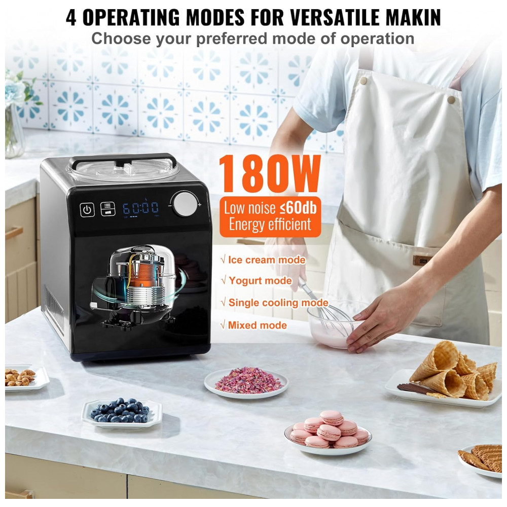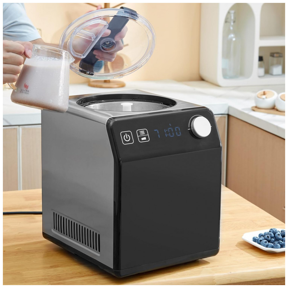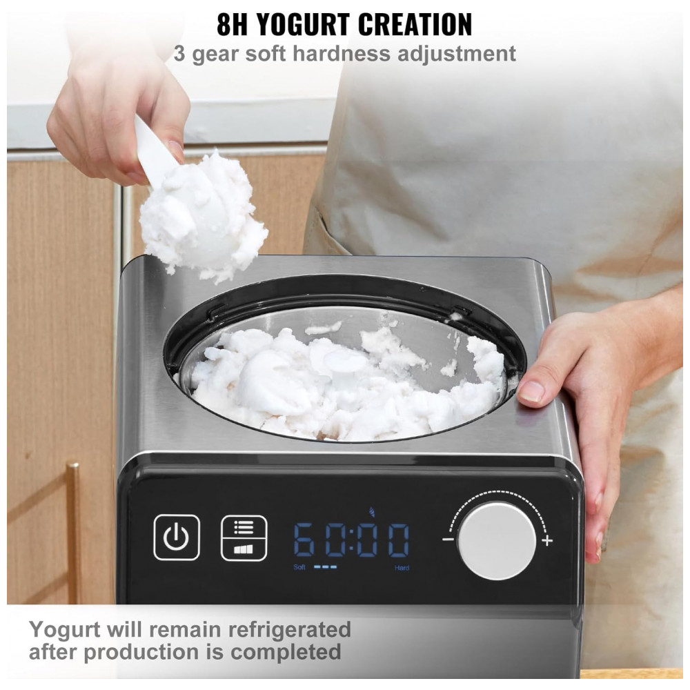 Criação Swift: Equipado com um potente compressor de 180 W para resfriamento, não há necessidade de pré congelamento antes do uso, permitindo a fabricação imediata de sorvetes. A máquina de iogurte de frutas utiliza um refrigerante R134A sem CFC, o que a torna energeticamente eficiente.