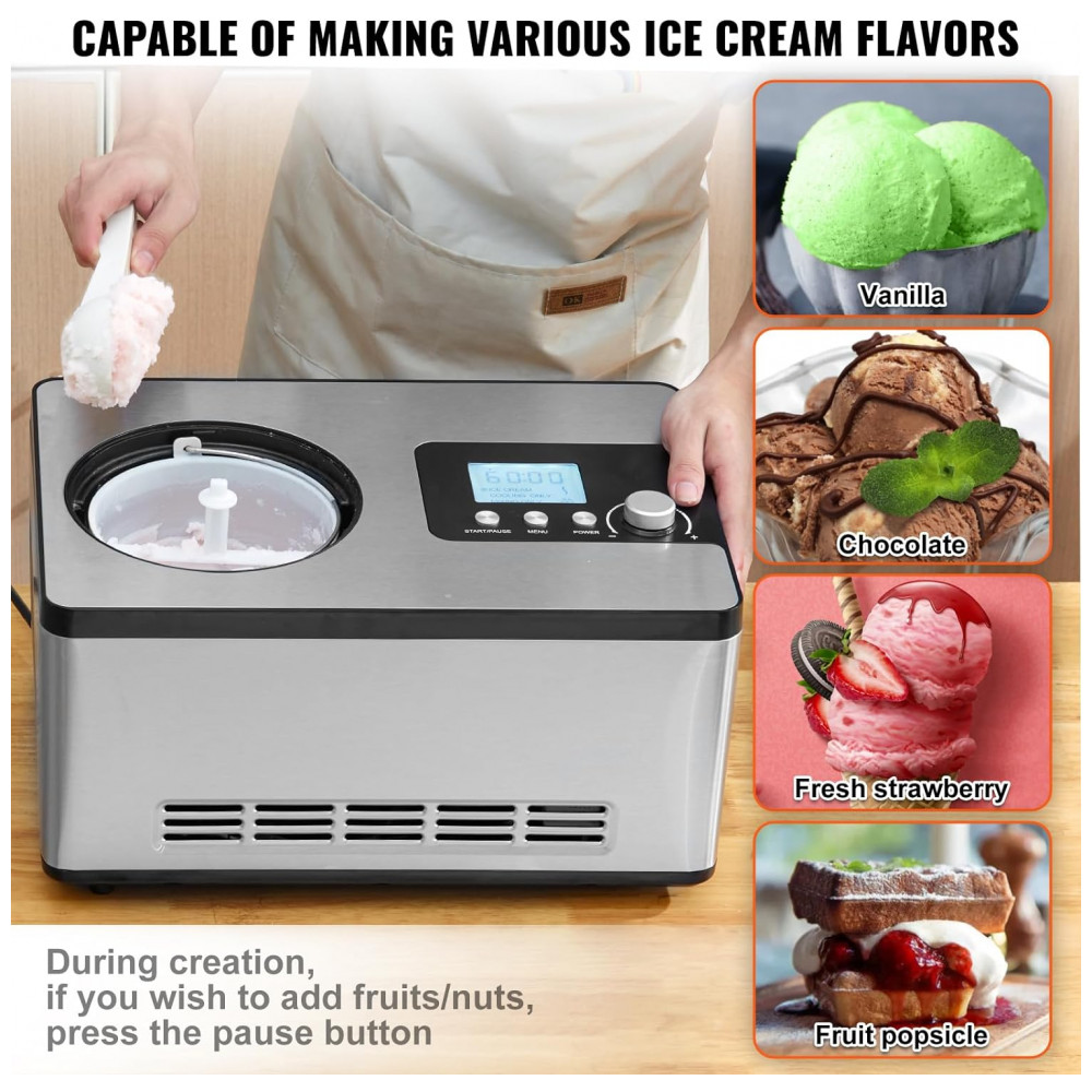 Criação Swift: Equipado com um potente compressor de 180 W para resfriamento, não há necessidade de pré congelamento antes do uso, permitindo a fabricação imediata de sorvetes. A máquina de iogurte de frutas utiliza um refrigerante R134A sem CFC, o que a torna energeticamente eficiente.