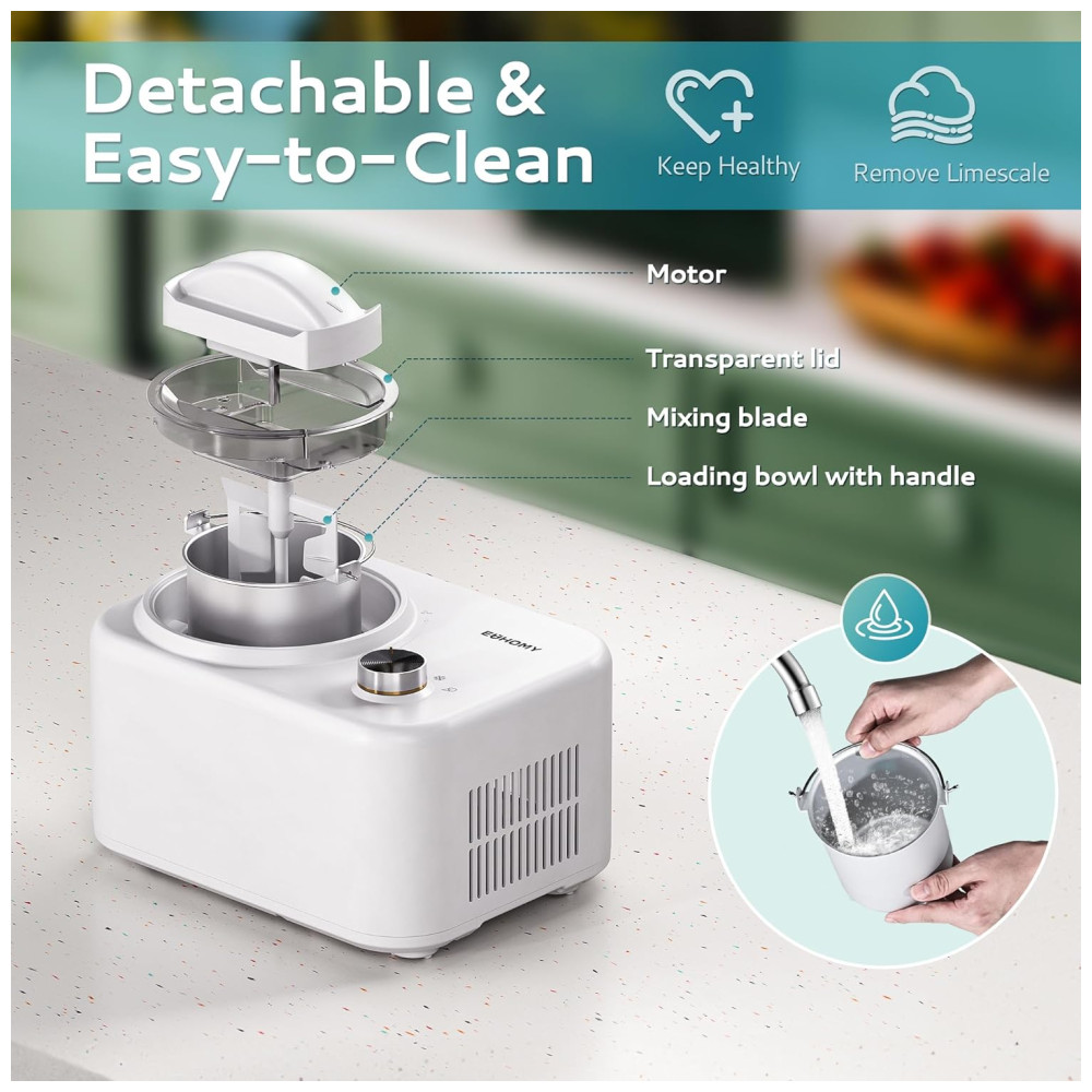 Projetos e designs exclusivos Destacável: a máquina de sorvete EUHOMY possui superfície lisa para aprimorar o estilo da cozinha, botão de controle único para operação simples e ranhuras em ambos os lados da parte inferior para fácil movimentação.