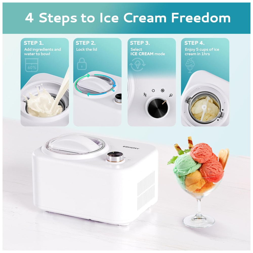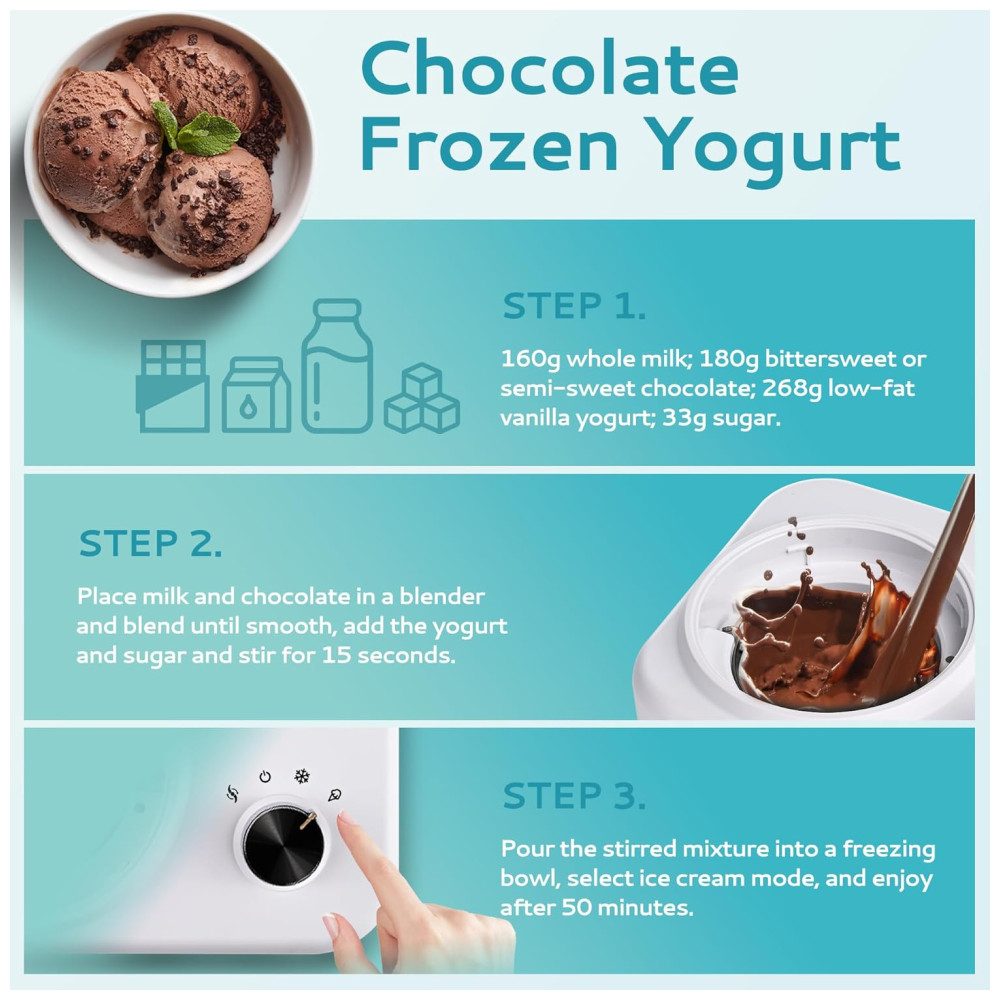 Fácil de usar e fácil de usar. e conveniente: adicione ingredientes à tigela, feche a tampa, selecione os modos e desfrute de 5 xícaras de sorvete em 1 hora Seu ruído inferior a 50dB garante um ambiente silencioso e 0,1 kWh, 1 hora economizará mais nas contas de eletricidade. quando o sorvete estiver pronto, mas não for consumido ou zenado a tempo, a máquina de fazer sorvete se manterá fria automaticamente por 1 hora para manter o frescor e um estado de resfriamento para evitar que o sorvete derreta. Além disso, o motor e o compressor possuem funções de autoproteção.