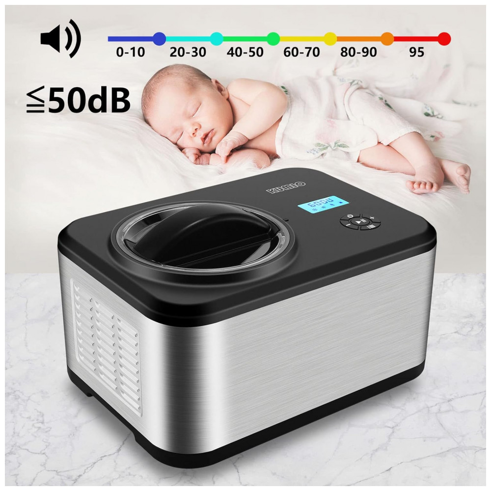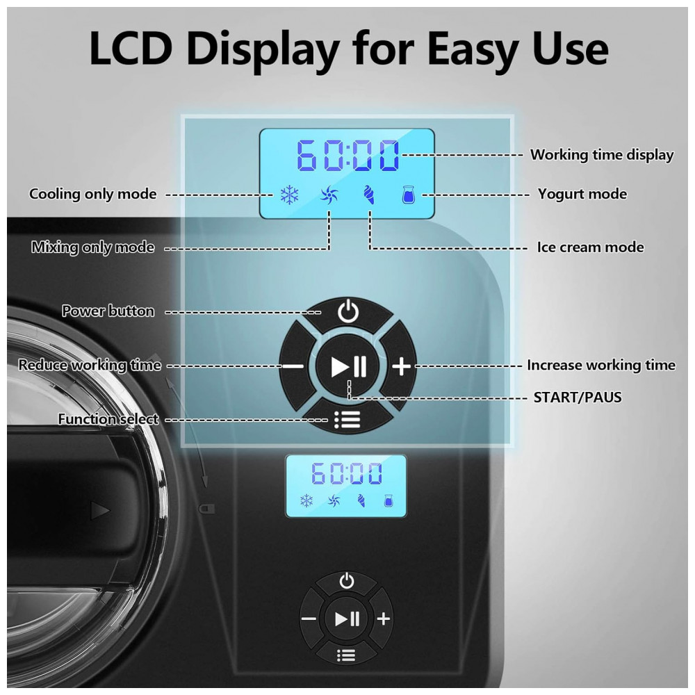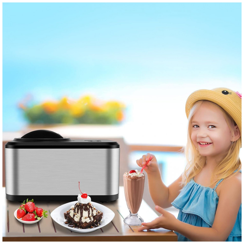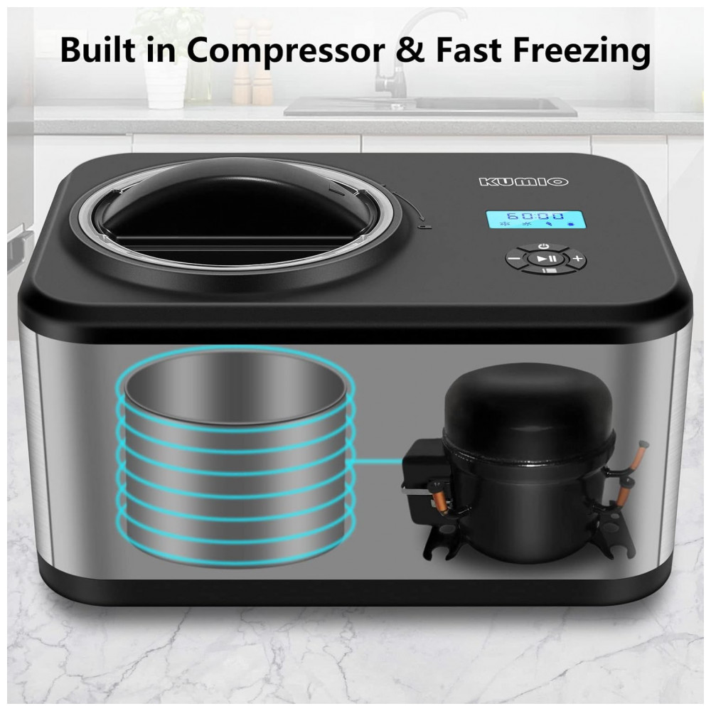 Compressor embutido Máquina de sorvete totalmente automática com compressor, o que significa sem pré congelamento, potência de 150W e mistura rápida e uniforme, você pode fazer deliciosos sorvetes em pouco tempo.