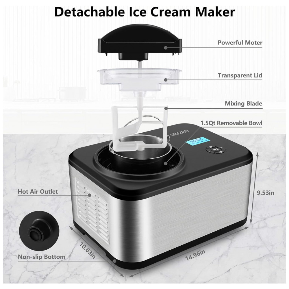 Capacidade de 1,5 litro faz 1,5 litro de seu sorvete favorito, iogurte congelado, gelato ou sorvete. A bancada do fabricante de sorvete permite que você faça deliciosos sorvetes caseiros, iogurte congelado, sorbet e outras guloseimas cremosas rapidamente, grande capacidade de 6 xícaras é perfeita para servir a família e amigos