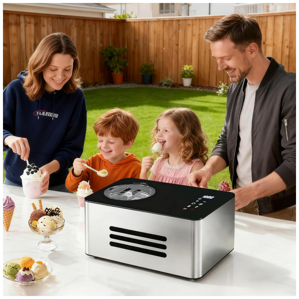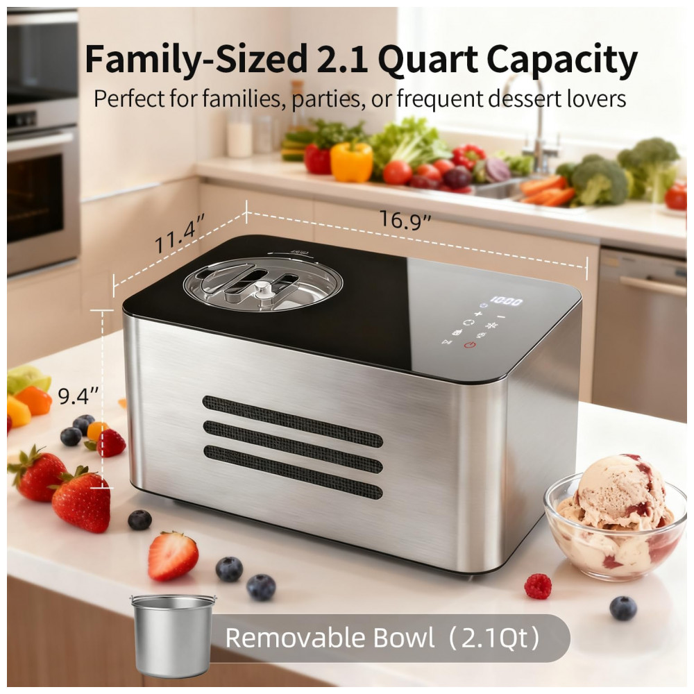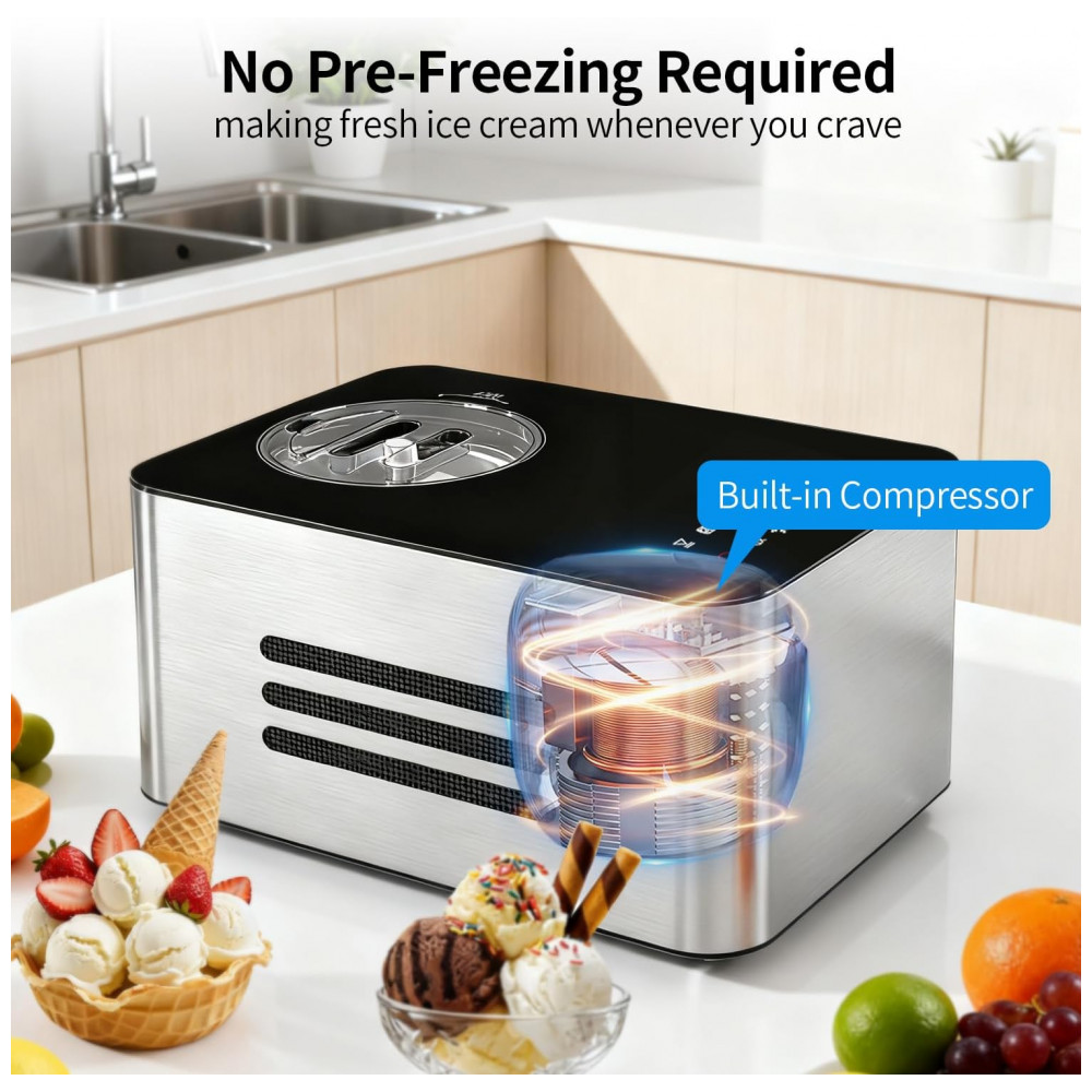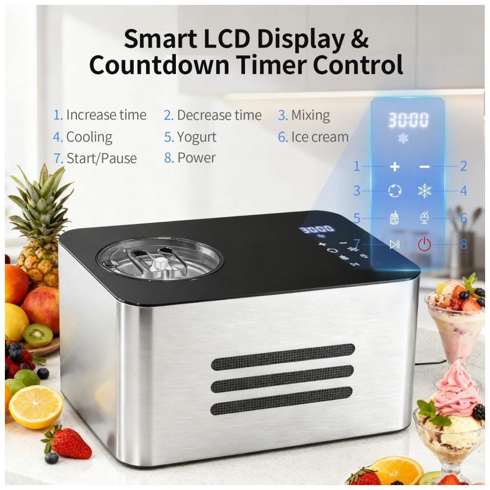 Máquina de Sorvete com Compressor QUWRI 4-em-1 Prata Capacidade 2L Sem Pré-congelamento Display LCD Temporizador
