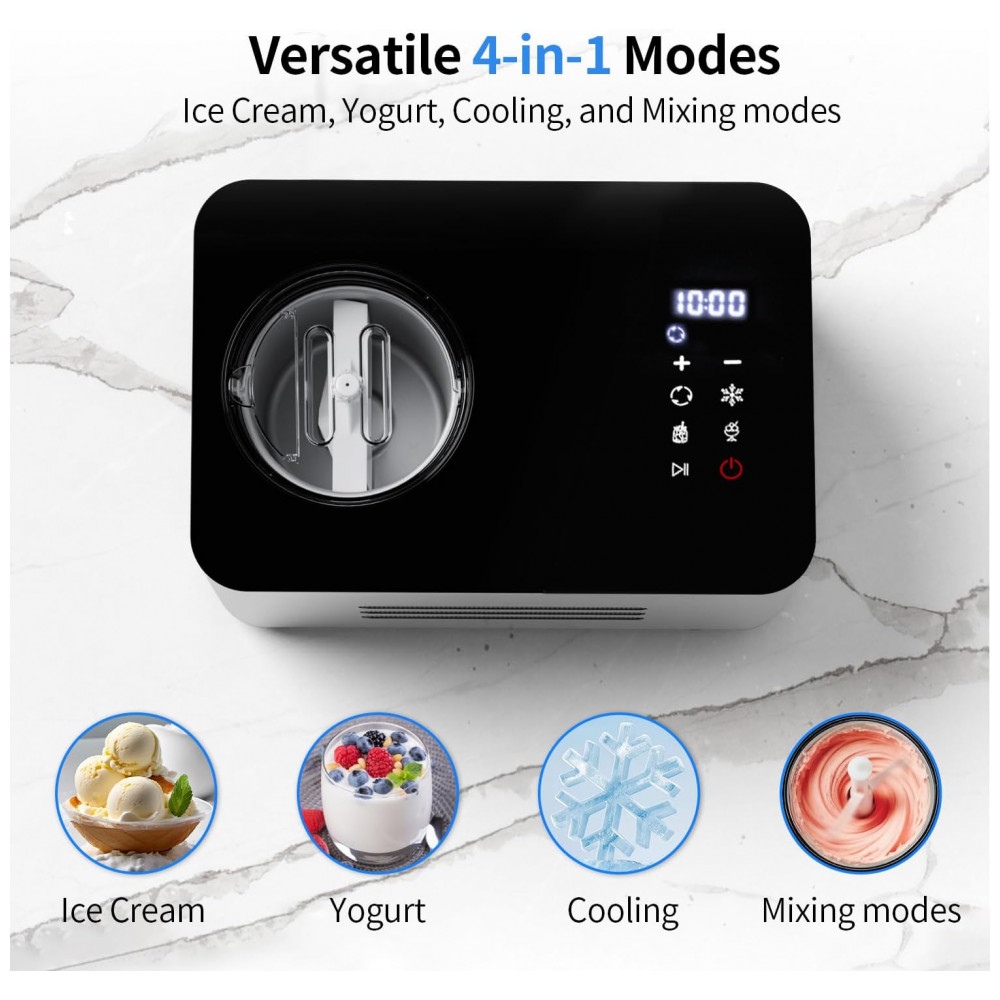 A máquina de sorvete QUWRI com compressor integrado elimina a necessidade de pré-congelamento, resfriando e batendo em cerca de 60 minutos via operação automática. Equipada com display LCD intuitivo e temporizador de contagem regressiva para monitoramento em tempo real de modo, tempo e status, garantindo texturas consistentes. Oferece 4 funções programadas: sorvete, iogurte, resfriamento e mistura, com configurações pré-definidas para operação simplificada.