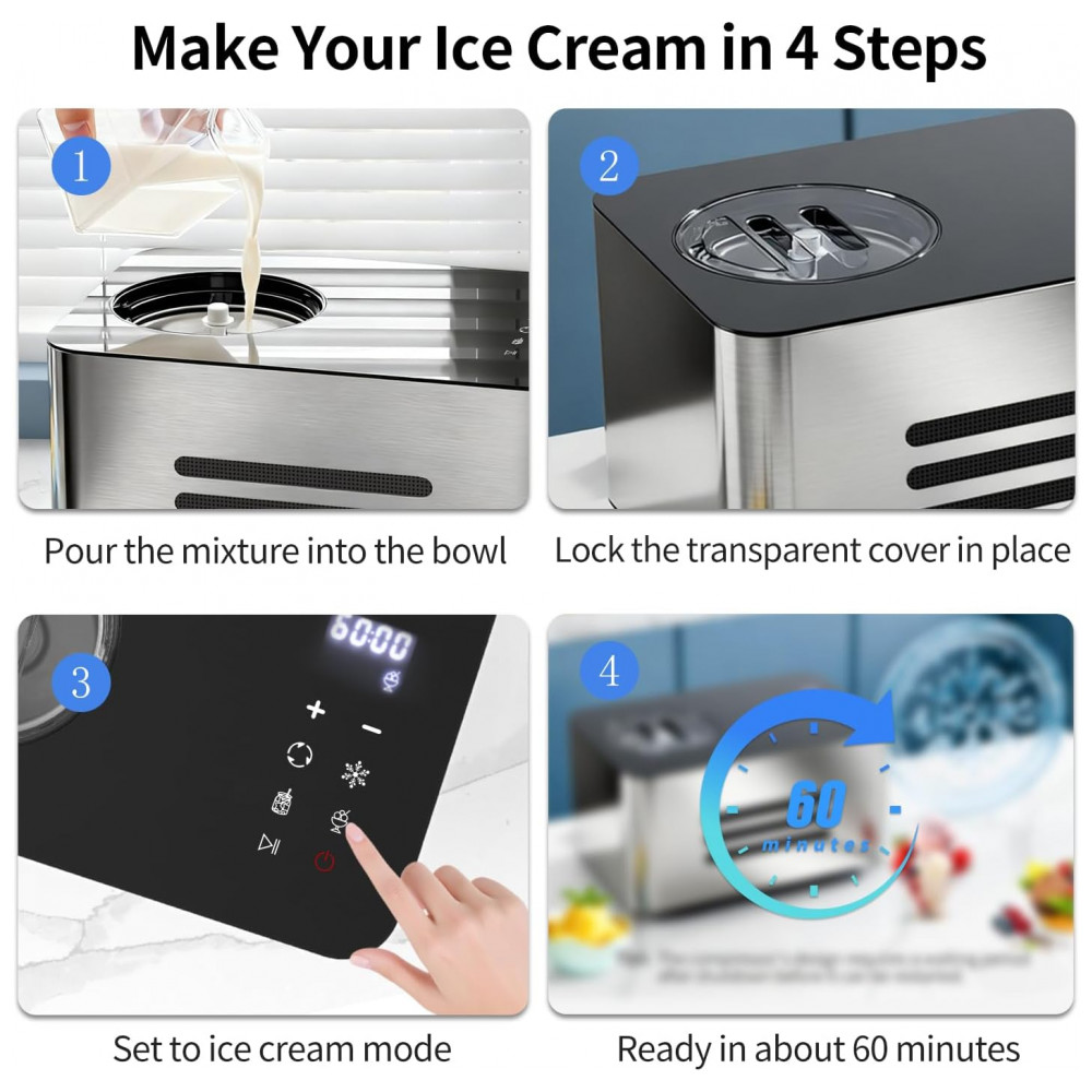 Capacidade de tigela de 2L permite lotes maiores, com cobertura transparente, lâmina de mistura e recipiente interno removíveis para limpeza rápida. Construída em aço inoxidável alimentar e plástico, opera com baixo ruído e design compacto para bancadas de cozinha. Processo envolve misturar ingredientes, verter na tigela, selecionar modo no LCD e iniciar, otimizando preparos de sorvetes, sorbets ou iogurtes.