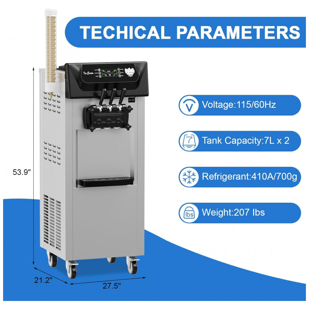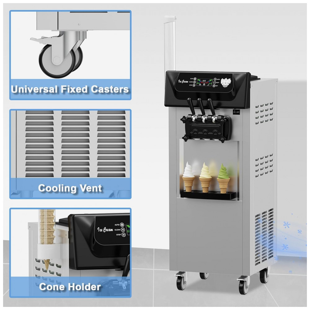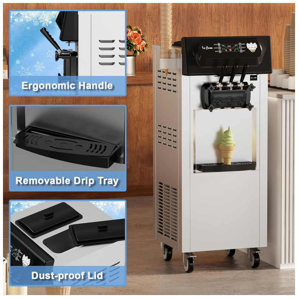 O sistema de resfriamento é composto por um compressor potente de 2200 W, que assegura congelamento rápido, textura uniforme e consistência adequada em sorvetes do tipo soft serve. O painel LCD inteligente facilita o controle da operação, exibindo informações de tempo de produção, quantidade restante e opções ajustáveis, incluindo nível de dureza do sorvete para personalização.