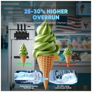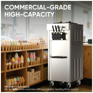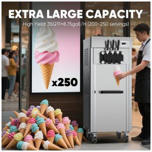 A Máquina de Sorvete Comercial Debylux CKX300 oferece alta capacidade de produção, capaz de fornecer até 35 QT (aproximadamente 33 litros) de sorvete por hora, com servido contínuo e consistente para até 200-250 porções de 100 g cada. Projetada para operação em temperaturas ambientes entre 5°C e 32°C, seu sistema conta com dois reservatórios (hoppers) de 5,5 litros de aço inoxidável SUS304 para servir simultaneamente três sabores, otimizando a variedade e rapidez no atendimento.