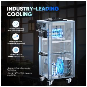 Equipado com motor de 1800 W e compressor duplo de pré-resfriamento, o equipamento realiza o congelamento inicial em apenas 10 minutos, com recargas subsequentes em 4 minutos ou menos. Seu corpo em aço inoxidável 401, certificado UL, proporciona robustez, resistência à corrosão e facilidade para higienização, atendendo às normas internacionais de segurança alimentar.