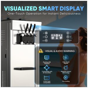 O painel inteligente LED permite controle automatizado da temperatura, dureza e temporizadores, além de apresentar indicação em tempo real do status da máquina. O equipamento inclui funções de resfriamento automático e limpeza com um toque, facilitando a operação e manutenção. O refrigerante utilizado é o R290, de baixo impacto ambiental e compatível com as regulamentações ambientais vigentes.