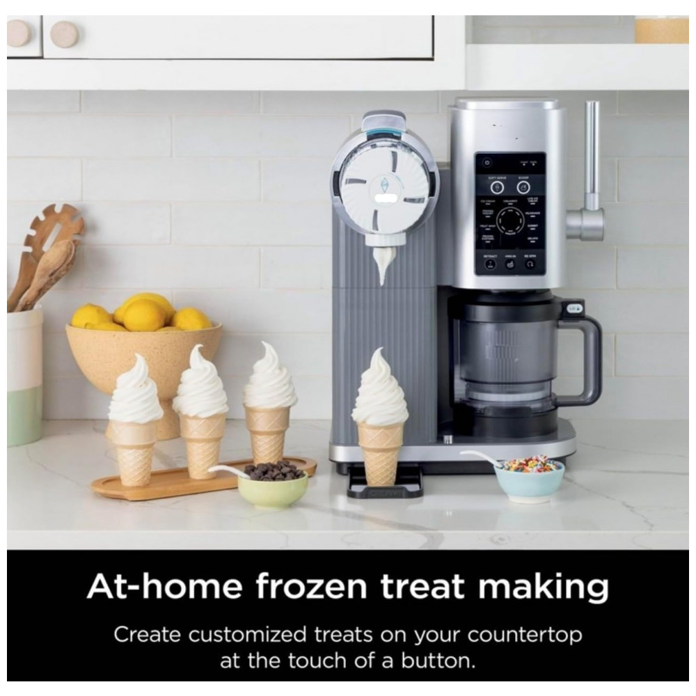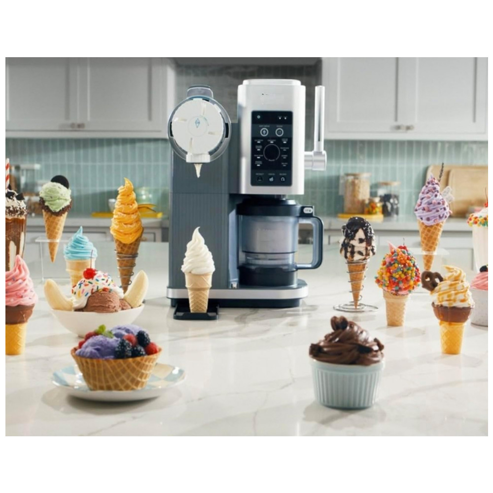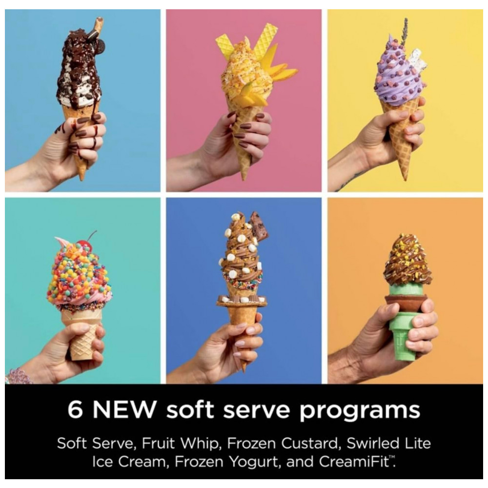 A Ninja CREAMi Swirl modelo NC701 é uma máquina automática para preparo de sorvetes, sorbets, frozen yogurt e outras sobremesas congeladas, projetada para uso residencial. O equipamento oferece 13 programas com acionamento por um toque, incluindo 6 programas específicos para soft serve, como Fruit Whip e Frozen Yogurt com textura aerada, permitindo selecionar o tipo exato de preparo de acordo com a formulação utilizada.