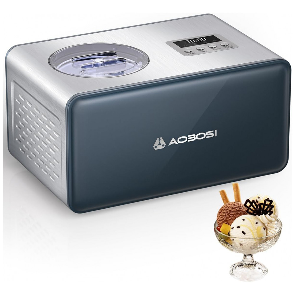 A AAOBOSI é uma máquina automática de sorvete residencial com compressor de 150W de alta qualidade, processando em menos de 60 minutos sem necessidade de tigelas pré-congeladas, graças à refrigeração contínua e proteção contra superaquecimento. Oferece 4 modos (sorvete, iogurte, mistura única, congelamento único) com função keep cool que mantém o estado congelado automaticamente, display LED, painel de botões push e temporizador com sinal sonoro de conclusão. Capacidade de 1,5 L permite 6-7 porções de iogurte ou 10-11 bolas de sorvete por ciclo, incluindo receitas técnicas.