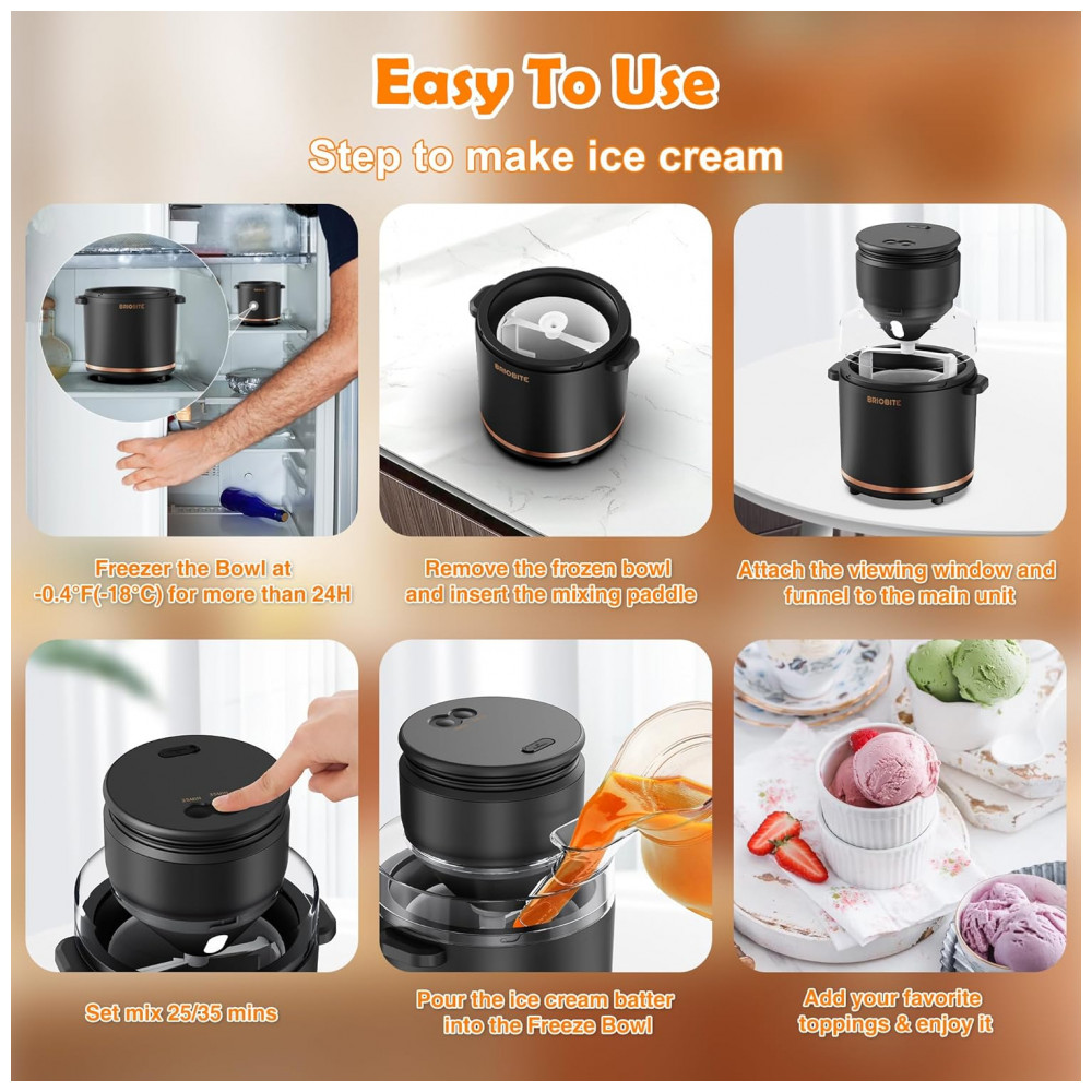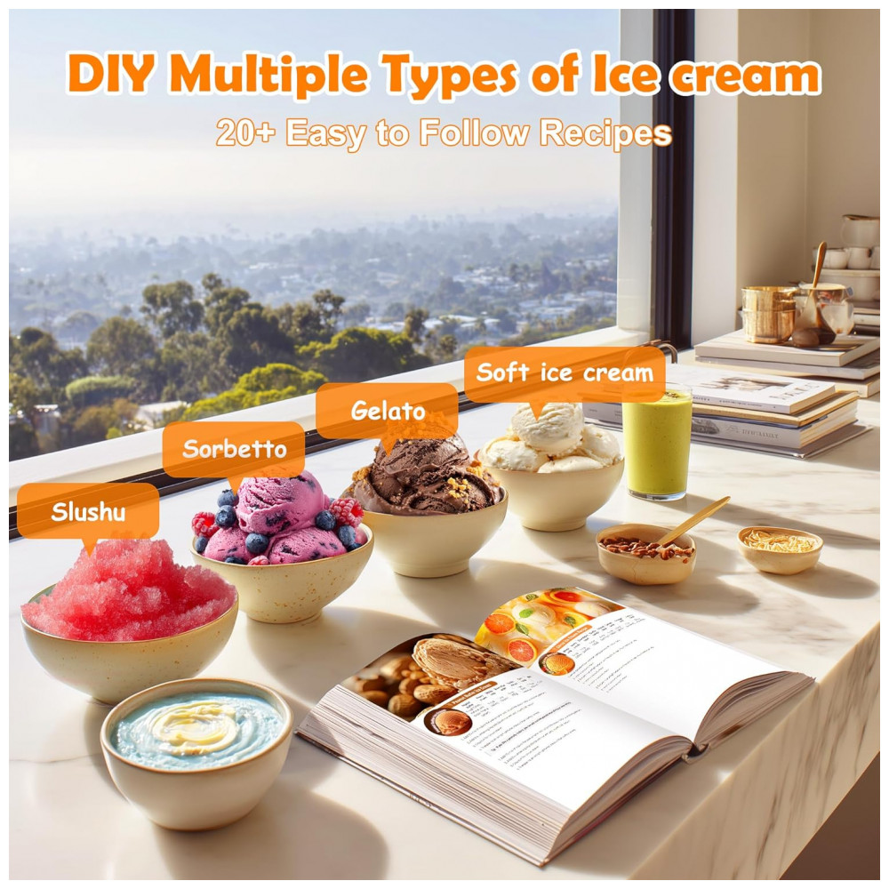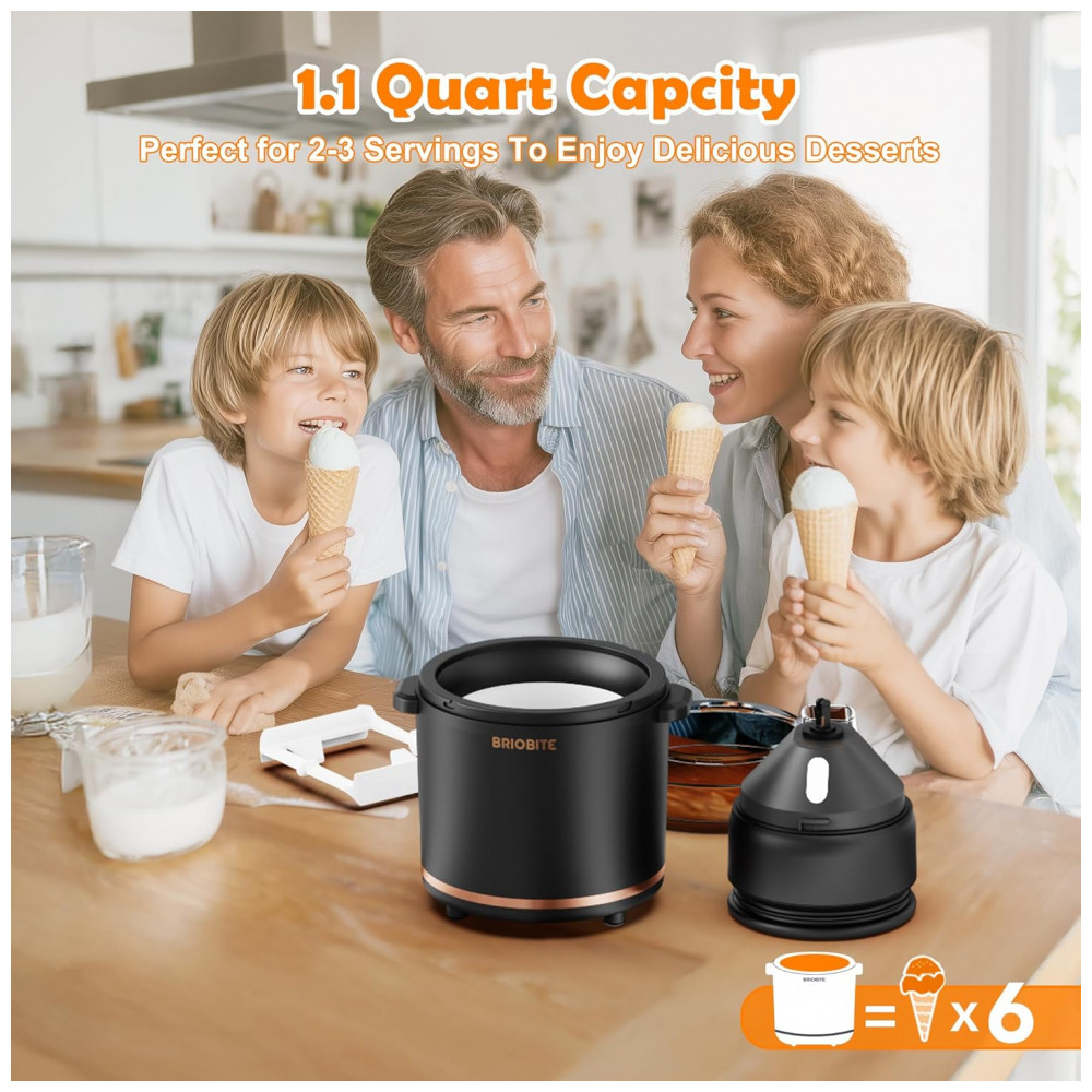 Desfrute de sorvetes deliciosos em casa com a Máquina de Sorvete Elétrica da BRIOBITE! Com capacidade de 1,04 Litros, é ideal para compartilhar com familiares e amigos. Acompanha livro de receitas com 20 opções incríveis, como baunilha, chocolate e morango. Produza sorvetes caseiros em apenas 25-35 minutos. Recarregável via USBC, possui bateria de lítio de 2600mAh. Fácil de usar e limpar, com desligamento automático e proteção contra superaquecimento.