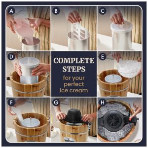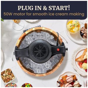 A Máquina de Sorvete Elétrica Elite Gourmet Old Fashioned de 5,67 Litros produz deliciosos sorvetes caseiros em apenas minutos. Possui um recipiente de alumínio resistente de 5,67 Litros e um motor potente de 90 rotações por minuto, tornando a fabricação de sorvete rápida, conveniente e divertida para toda a família! Ideal para entreter em festas familiares, churrascos e piqueniques, utilizando todas as suas receitas favoritas de sorvete, sorbet, gelato e até mesmo iogurte congelado. O motor aciona uma pá de seis lâminas que incorpora ar nos ingredientes, produzindo um sorvete cremoso e suave. A pá rapidamente quebra biscoitos, frutas, gotas de chocolate ou uma variedade de outras coberturas deliciosas e as integra completamente à mistura. O balde de madeira old-fashioned de Appalachian contém gelo e sal, mantendo o recipiente na temperatura ideal de 10ºC. Todas as peças são removíveis para facilitar a limpeza. CAPACIDADE DE 5,67 LITROS Congele até 6 quartos de sorvete, gelato, iogurte congelado ou sorvete. Perfeito para festas, lanches, churrascos, piqueniques e grandes eventos – suficiente para alimentar a todos! PROCESSO SIMPLES DE 3 PASSOS 1 Misture seus ingredientes favoritos e coloque no recipiente, 2 monte a unidade e adicione gelo e sal, 3 ligue e aperte o botão. RÁPIDO E FÁCIL DE USAR A máquina de sorvete e sobremesas é simples de usar. Basta adicionar a mistura de ingredientes na máquina, usar o motor automático ou manivela manual e você terá uma sobremesa saborosa em pouco tempo, do jeito antigo. OPERAÇÃO SILENCIOSA O motor elétrico trava convenientemente no balde, garantindo que todas as peças estejam interligadas para uma operação segura e silenciosa. A LIMPEZA É FÁCIL O recipiente de alumínio permite limpar facilmente, tornando a limpeza posterior uma brisa. Armazene facilmente o sorvete restante em seu freezer, além de incluir uma tampa transparente que se encaixa diretamente no recipiente do sorvete. Recipiente e tampa podem ser lavados na lava-louças.