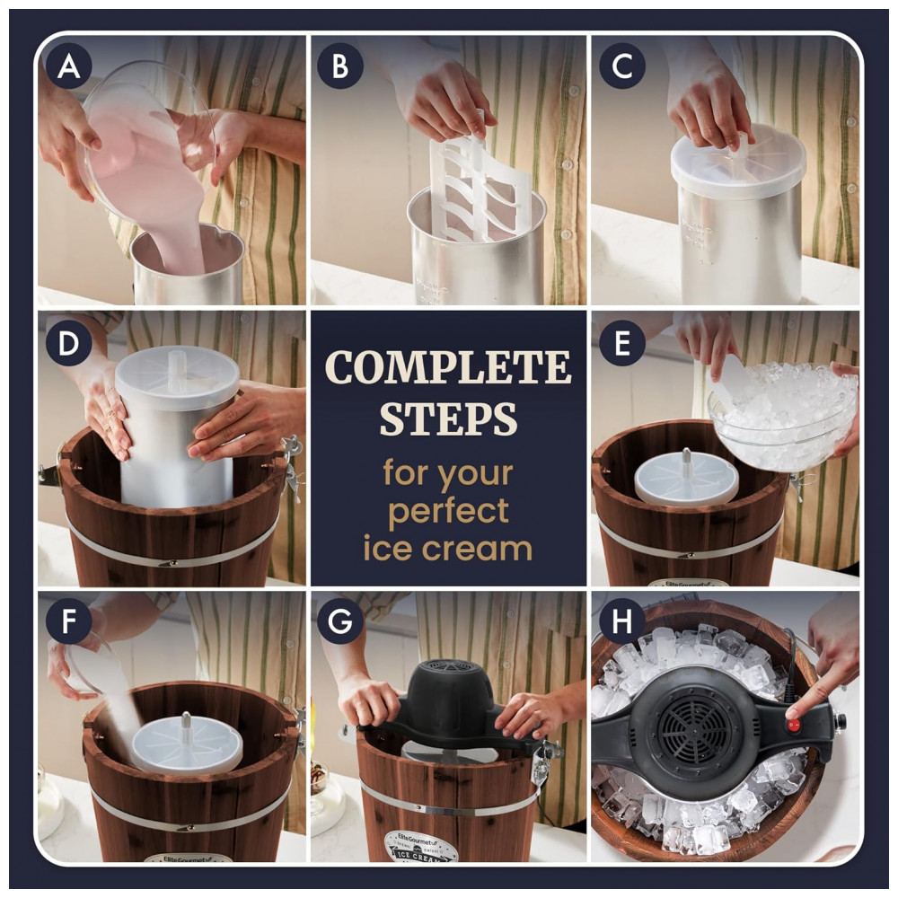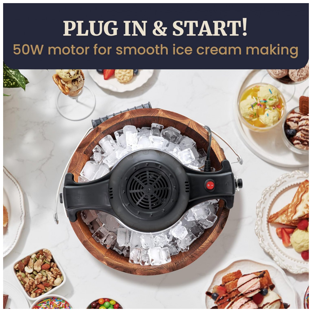 A Máquina de Sorvete Elétrica Vintage Elite Gourmet EIM949 é capaz de produzir deliciosos sorvetes caseiros em questão de minutos. Com um recipiente de alumínio resistente de 4 quartos e um motor potente de 90 rotações por minuto, fazer sorvete se torna rápido, conveniente e divertido para toda a família! Ideal para entreter em festas familiares, churrascos e piqueniques usando todas as suas receitas favoritas de sorvete, sorbet, gelato e até mesmo iogurte congelado. O motor aciona um pá de seis lâminas que incorpora ar aos ingredientes, resultando em um sorvete macio e cremoso. A pá rapidamente tritura biscoitos, frutas, gotas de chocolate ou uma variedade de outras coberturas deliciosas e as integra completamente à mistura. O balde de madeira de nogueira estilo antigo mantém gelo e sal grosso, mantendo o recipiente a uma temperatura ideal de 10°C. Com capacidade para 6 quartos, é possível congelar até 5,67 Litros de sorvete cremoso e gelado, perfeito para festas, lanches, churrascos, piqueniques e grandes eventos! O processo é simples, em apenas 3 passos: misture os ingredientes, monte a unidade, adicione gelo e sal e ligue. Fácil de usar e limpar, a máquina de sorvete é silenciosa e garante uma operação tranquila e segura. Acompanha um recipiente de alumínio e tampa transparente que se encaixa perfeitamente, podendo ser lavados na máquina de lavar louça.