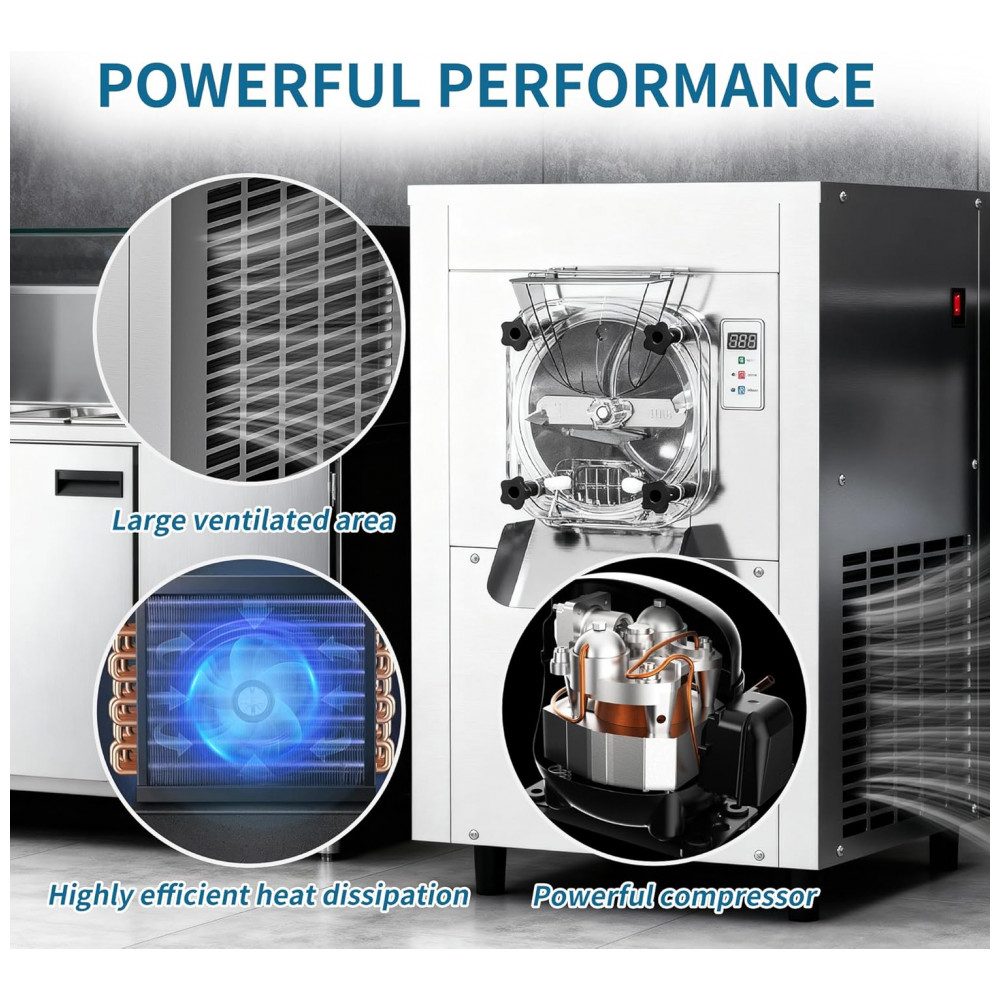 A Máquina de Sorvete Hard Ice Cream da AnyDoor é equipada com compressor de alta qualidade de 1600W, que oferece resfriamento rápido e eficiente com baixo consumo energético. A capacidade do cilindro frigorífico é de 6 litros, possibilitando a produção contínua de até 18 litros (4,7 galões) de sorvete por hora, adequada para uso em bares, cafeterias e estabelecimentos comerciais de alimentação.
